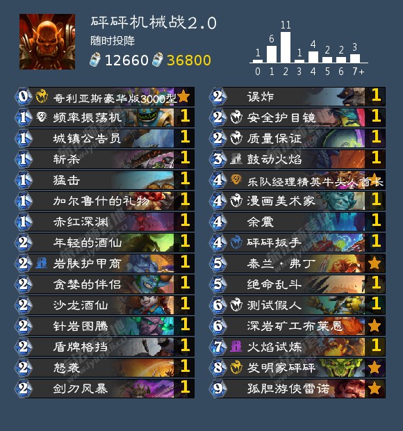 砰砰扳手:这张卡就算是我个人喜好了,能配合到6费的测试假人的话就是一波强力的返场节奏,而且作为斩杀组件,这张卡让我有很大机会在第11回合斩杀对面,我本人对这张卡爱不释手,但我好友把这张卡换成叠甲锤也是2天就上传说了,看大家喜好吧,卡组中应该还有一些卡位是可替换的,还是有不错的调整空间的。