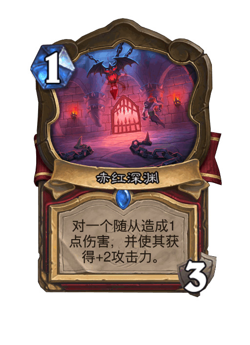 赤红深渊:整个卡组的润滑剂,不能不带,价值最大的用法是拍奇利亚斯时打掉自己的圣盾,让奇利亚斯能送掉的同时复生起来再撞一下,吸一口,毒一个。其次是补刀鼓动火焰、余震、测试假人、误炸留下的1血怪,再次能配合一下斩杀,带斩杀也是因为这卡组常常留下残血。哪怕最次也是分3回合点掉三个报告兵,也完全不亏。
