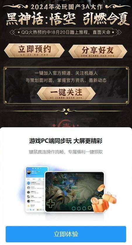 《黑神话:悟空》现已在QQ开启专属预约渠道,诚邀玩家们一键预约游戏。玩家不仅能加入官方专属频道,更有机会近距离接触游戏策划团队,参与面对面交流,还能掌握官方资讯及最新动态。