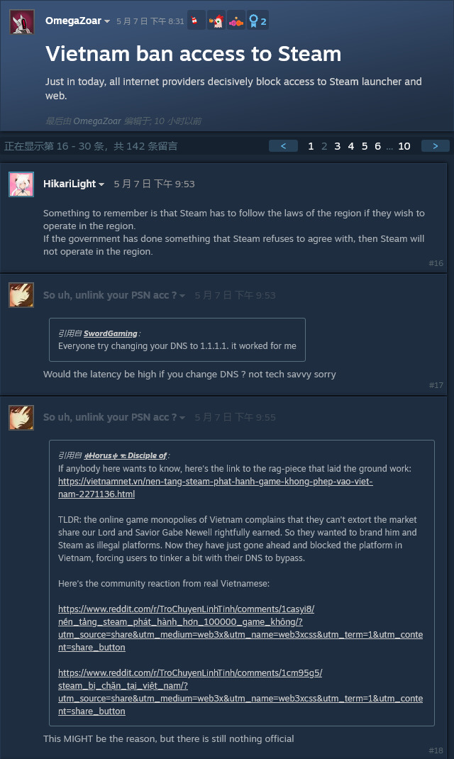 越南玩家在 Steam 论坛上表示,该国所有网络供应商突然一同屏蔽了 Steam 应用和浏览器的访问。一位评论者表示,他在与一位了解内幕的人交谈后得知屏蔽 Steam 是“来自上头”的命令。