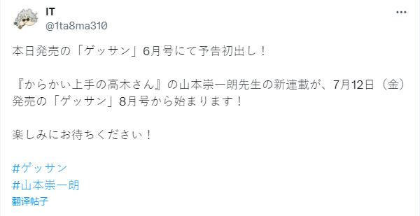 近日山本崇一朗的新作曝光,预计会在今年《月刊少年Sunday》的6号刊开始释出,并于7月12日的《月刊少年Sunday》的8号刊展开连载。