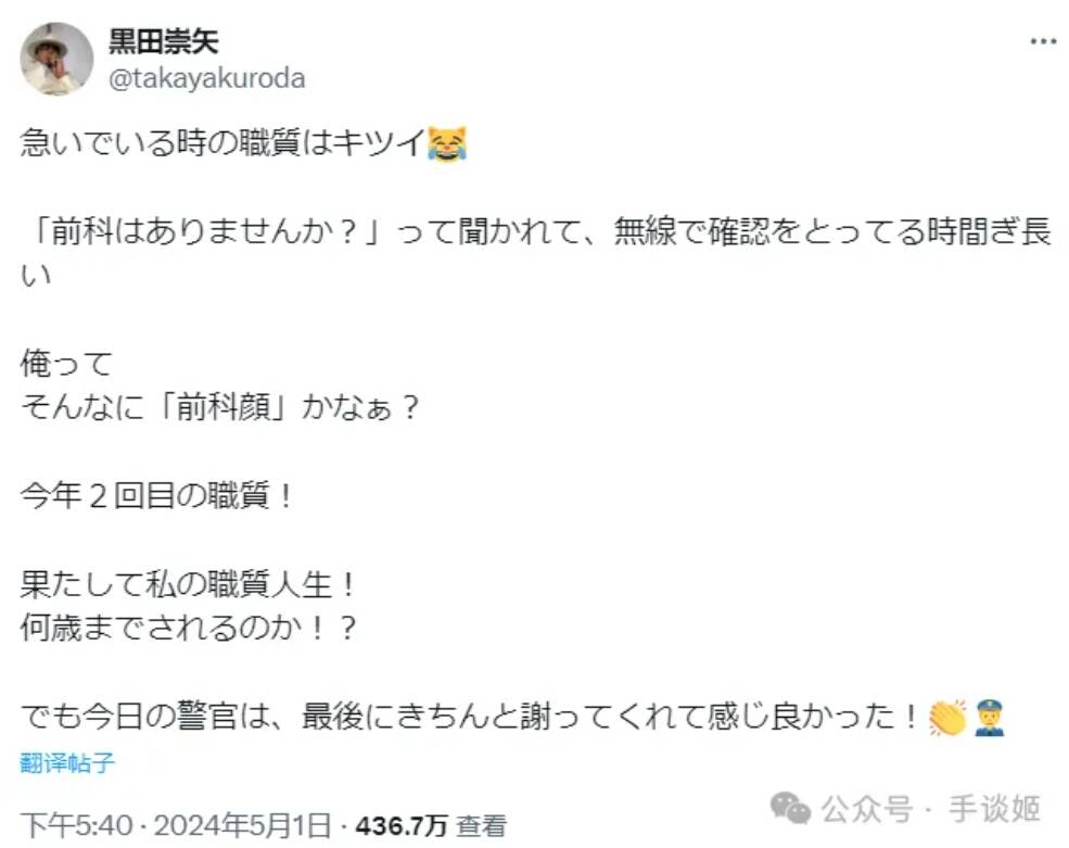 这样的黒田崇矢,在前几天发推特抱怨说,今年已经是第二次遭到警察的盘问了。