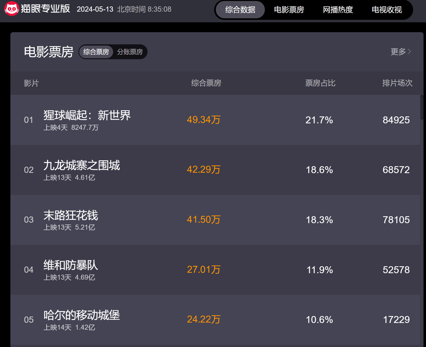 据猫眼专业版数据显示,《猩球崛起4:新世界》国内上映4天,票房8247.8万元,尚未破亿。