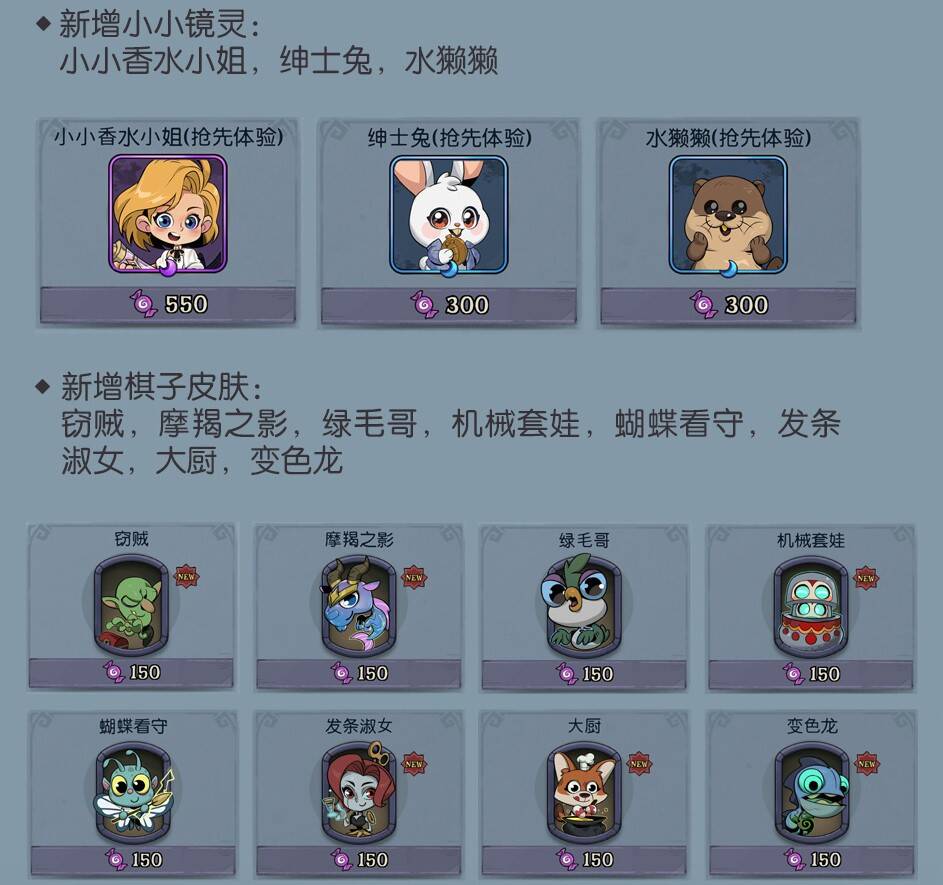 新增棋子皮肤:窃贼,摩羯之影,绿毛哥,机械套娃,蝴蝶看守,发条淑女,大厨,变色龙