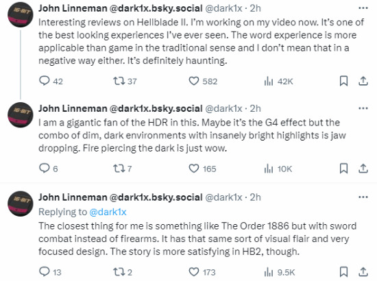 “这个游戏很接近《教团1886》,只不过用剑斗代替了枪械。尽管《地狱之刃2》的故事更有趣,但它们或多或少有相近的视觉风格和设计。”