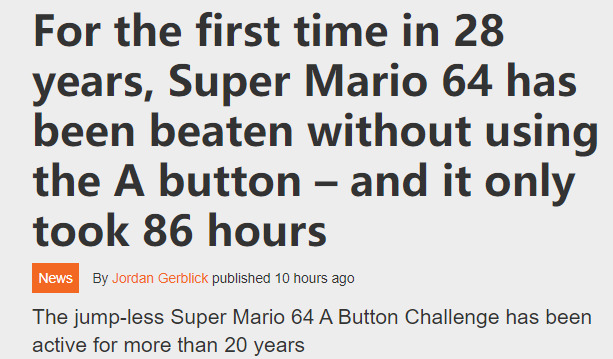任天堂经典名作《超级马里奥64》已经诞生许多年了,至今依然有玩家之谜其中,不过玩法却相当变态,日前一位高玩全程不按A键(跳跃)通关了《超级马里奥64》,耗时多达约87小时。