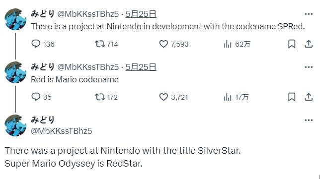 此前,对于“SilverStar”,Midori表示它曾经积极开发中,但目前情况未知。其名称中没有“Red”一词,但考虑到《超级马里奥:奥德赛》的代号是“RedStar”,该作可能与其有所关联。