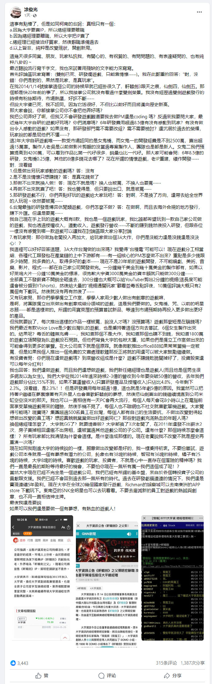 凃俊光说:“我自己现在手上玩的游戏大概有8款,我也是一个游戏玩家,我比谁都希望玩到一款自己家公司做的游戏,但没有哪款游戏可以让他觉得能分享讨论的。大宇自研的游戏好玩吗?你们满意吗?6年研发费用超过8.5亿新台币,有没有感动到玩家?有没有做出令人感动的游戏?如果没有,那研发部门需不需要改组,需不需要检讨?”