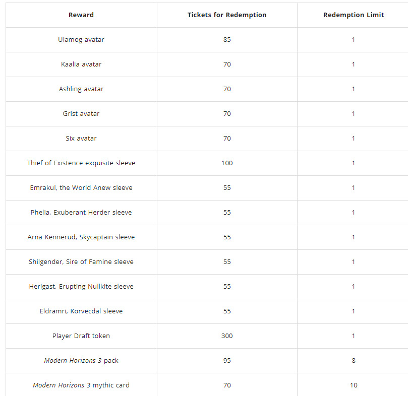 (中间列为兑换所需奖券数量,右边为兑换上限)