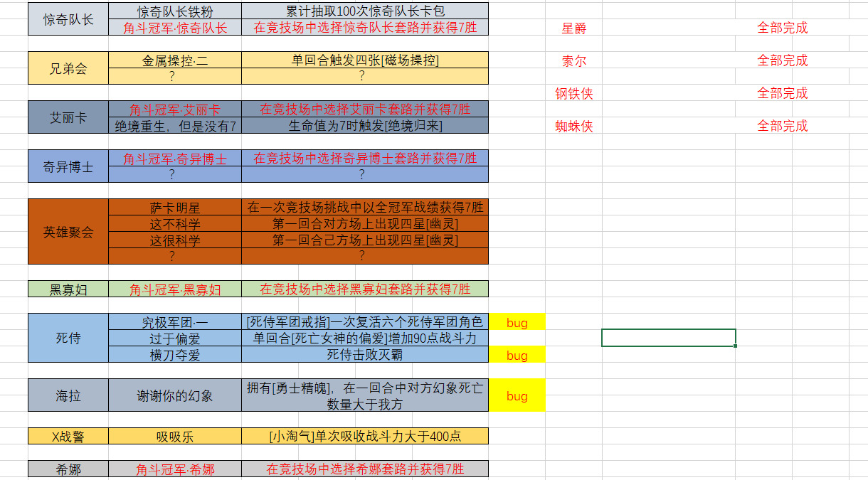 求助帖,本人想完成漫威对决全部成就,下图是还未完成的成就,想问一下大家有无知道打问号的未知成就,以及显示bug的成就我试了很多次均未完成,求助大佬帮助,谢谢。