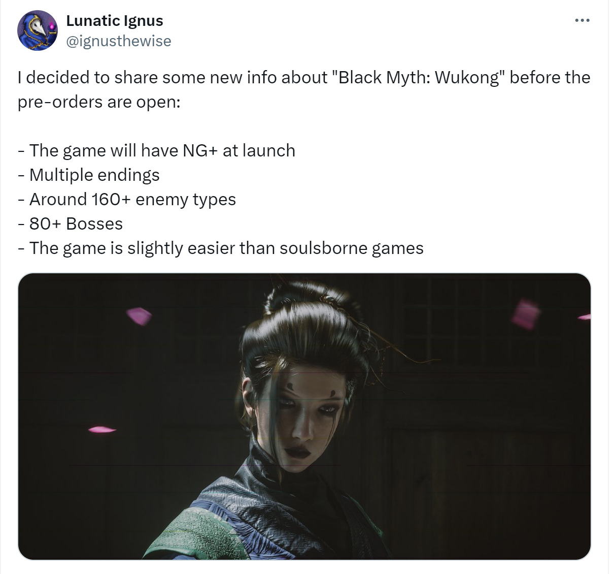 《黑神话:悟空》公布了新预告,并公开了售价。今日外网有博主爆料了一些细节,而这位博主Lunatic Ignus准确曝出了《黑神话:悟空》将于5月19日公布消息。