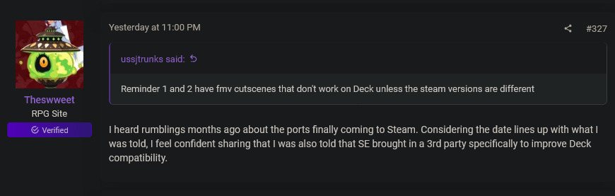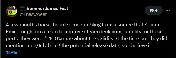 随后他在论坛 ResetEra 上也进行关于 Steam 版《王国之心》的讨论。在这他提到了 SE 邀请第三方的消息。他写道:“几个月前我就听到油管这些移植版终于登陆 Steam 的传闻。考虑到日期和我被告知的一致,我现在有信心分享,我还被告知 SE 专门引入了第三方(开发商)来提高 Deck 兼容性。”