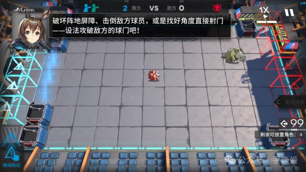 让源石球移动主要分为两种途径,一种是不断攻击施加足够的力量让球射出去,有点像《旷野之息》的时停玩法;一种是依靠具有位移能力的干员直接进行推拉,总之把球送入敌方球门就算胜利。