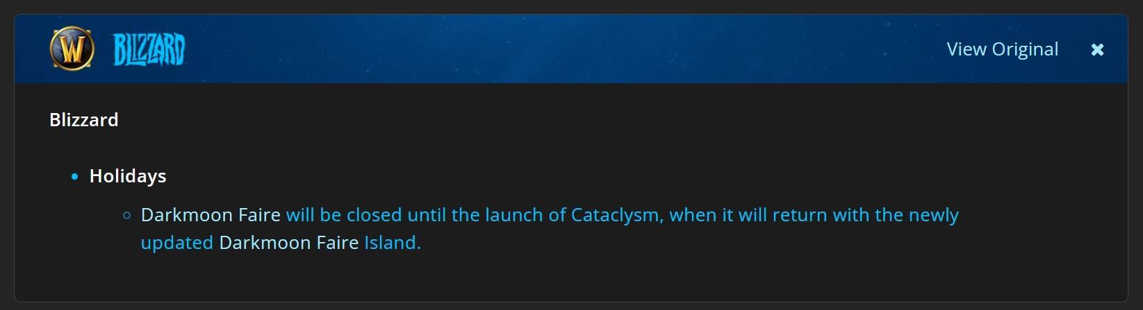 在大灾变怀旧服的前夕版本中,暴雪曾经宣布短暂地关闭暗月马戏团,以对暗月马戏团进行升级。
