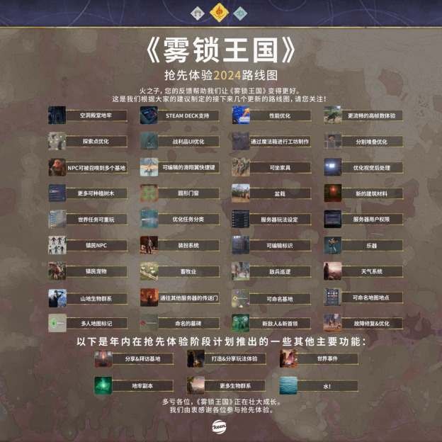 《雾锁王国》于2024年1月24日在Steam上开放抢先体验,未来计划全面发布1.0版本并登陆主机平台。有关《雾锁王国》的最新信息,请在Steam上购买游戏,加入官方QQ群(7群:612261757),并在Bilibili官方账号和抖音上关注游戏。