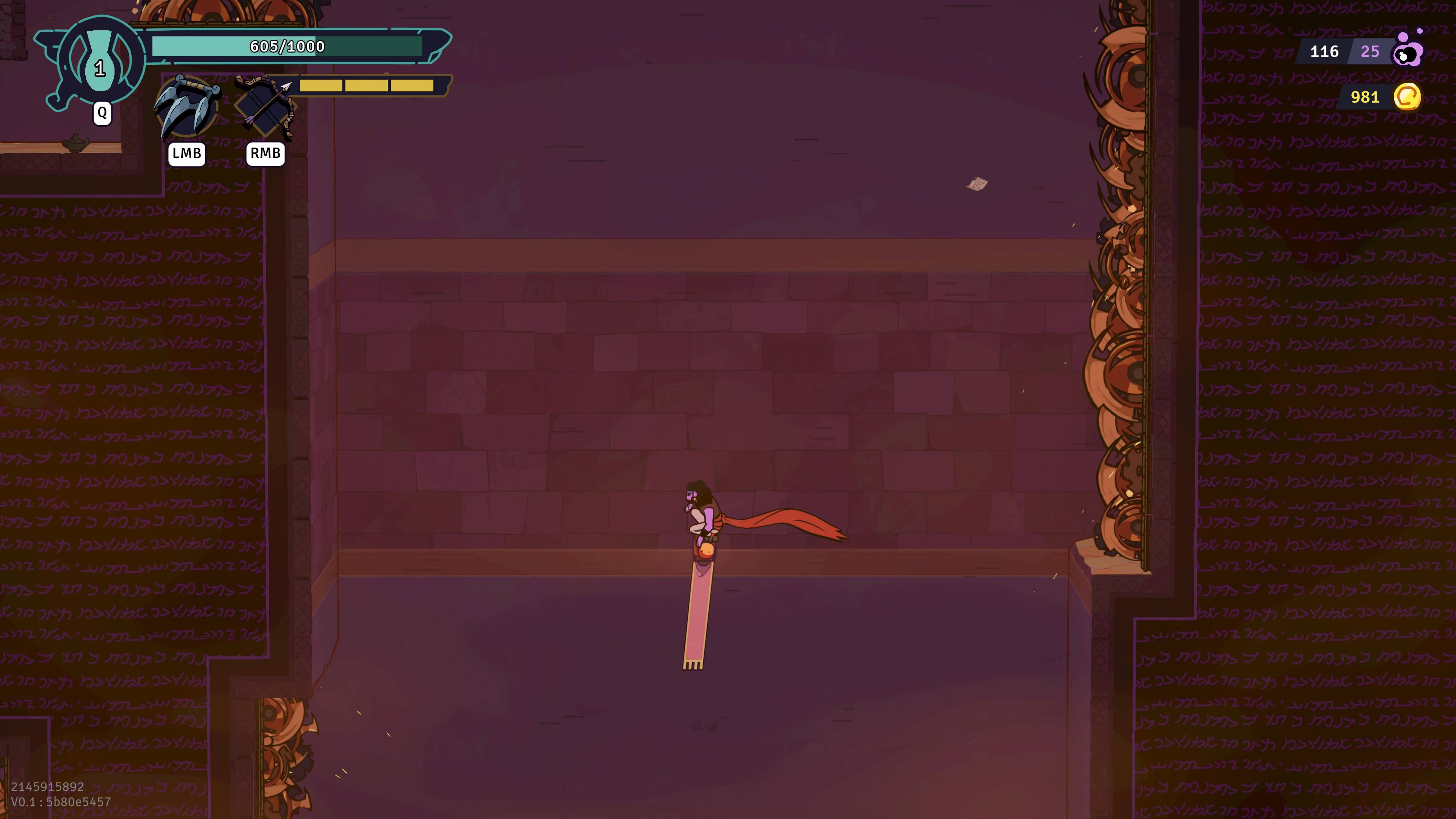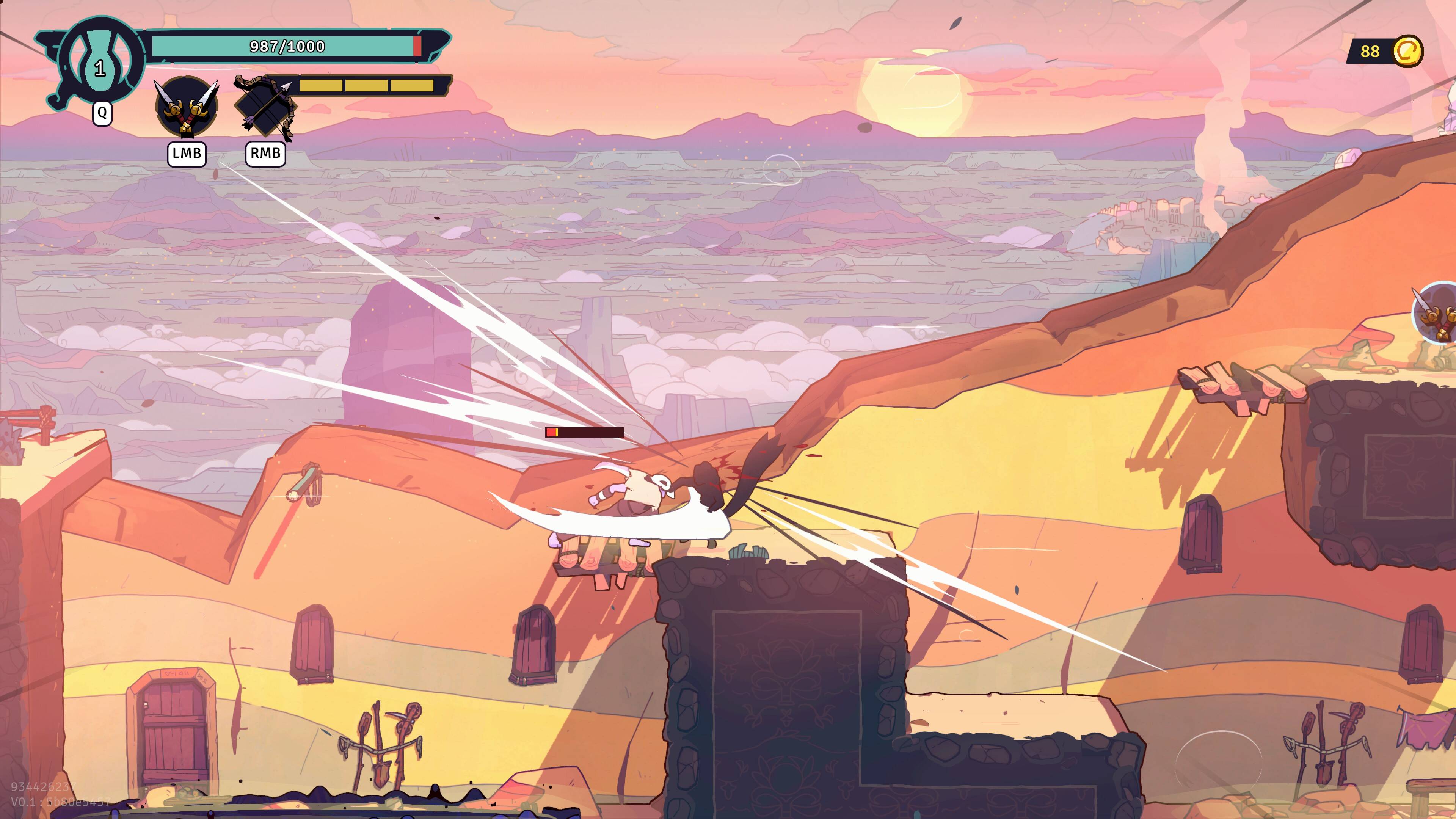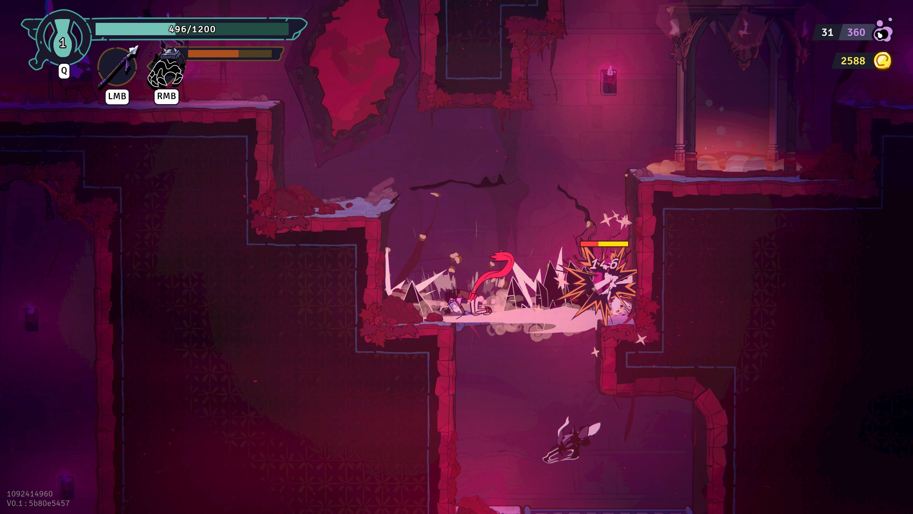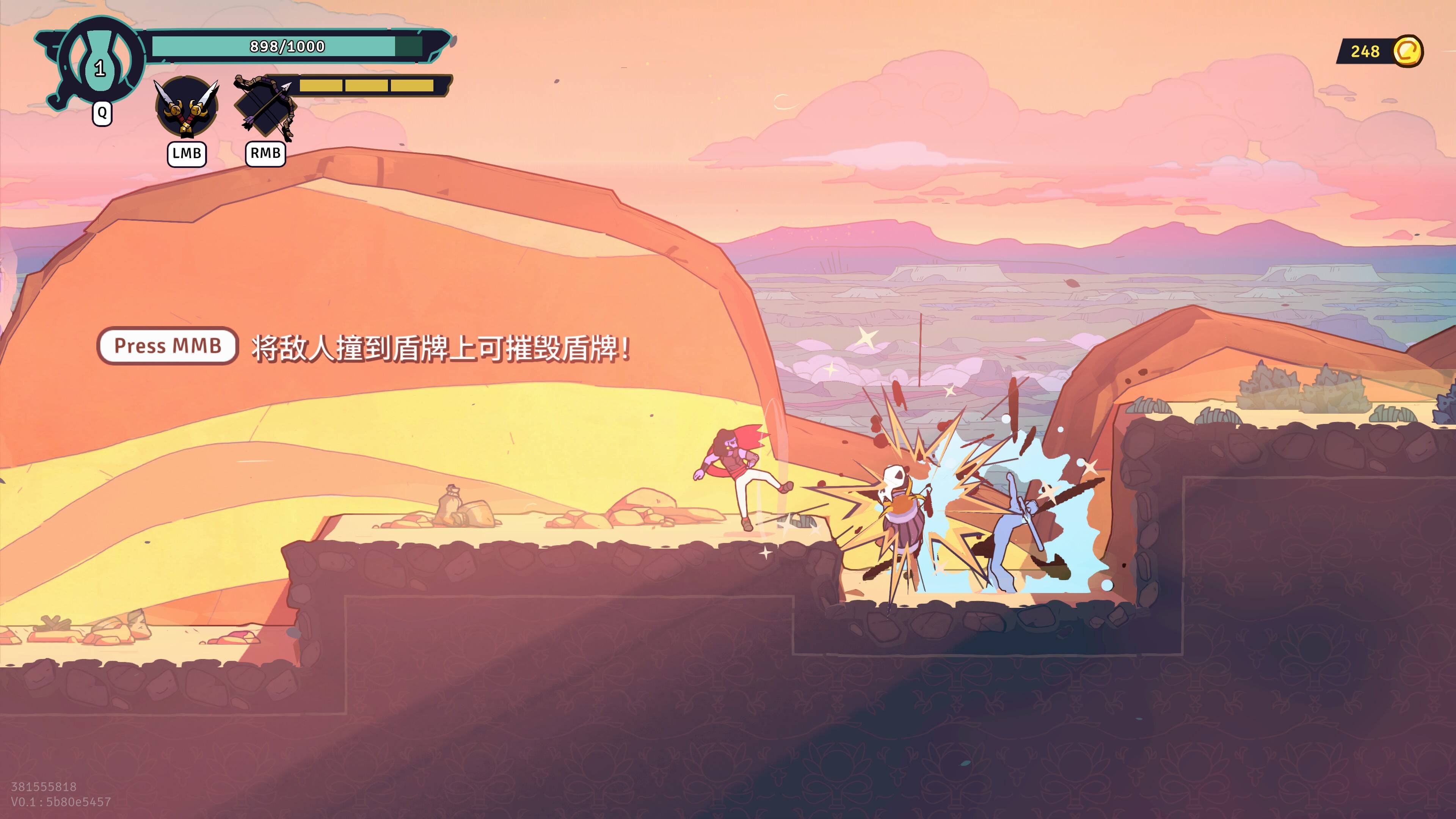 同时,近战动作我们可以使用下砸、普攻、蓄力攻击等,每种武器的特殊攻击也不一样,我们还可以使用翻越到敌人身后来躲避敌人攻击,但是这个翻越只能对着敌人翻越才可以有无敌帧,其他时候使用并没有无敌帧,这样的话比如远程敌人和冲刺来的敌人不可以被闪避掉,游戏甚至还没有格挡,这个翻越就成了鸡肋,在怪物多的时候就算翻越过去,敌人依旧会击中玩家。除此之外还有一个踢技,踢到敌人后,敌人之间会被碰撞,与墙也可以碰撞,如果没有物体则会飞出去,让敌人进行摔落伤害,或者被陷阱击杀。如果踢技让敌人之间碰撞的话,会破掉敌人的护盾,但有护盾的敌人不可以踢飞,并且踢技没有伤害,到后期护盾敌人多了之后,踢技又成为了一个鸡肋技能。游戏的整体动作较为流畅,但打击感和手感来说,还需要优化,打击感让人感觉非常软绵绵感,像砍棉花。