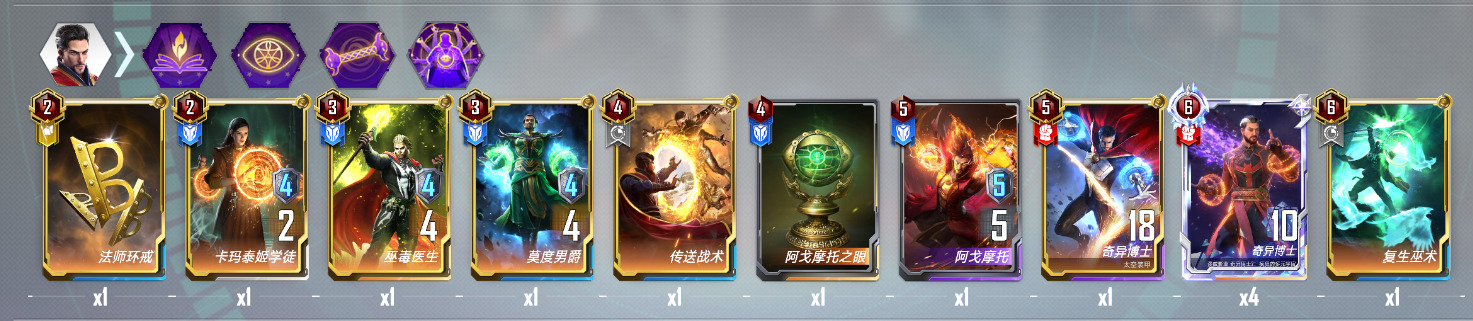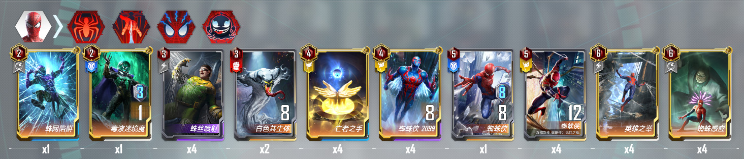 4费:亡者之手用于防夜巡以及召唤手中由红博士链接效果生成的蜘蛛侠单位。2099提供大量眩晕。