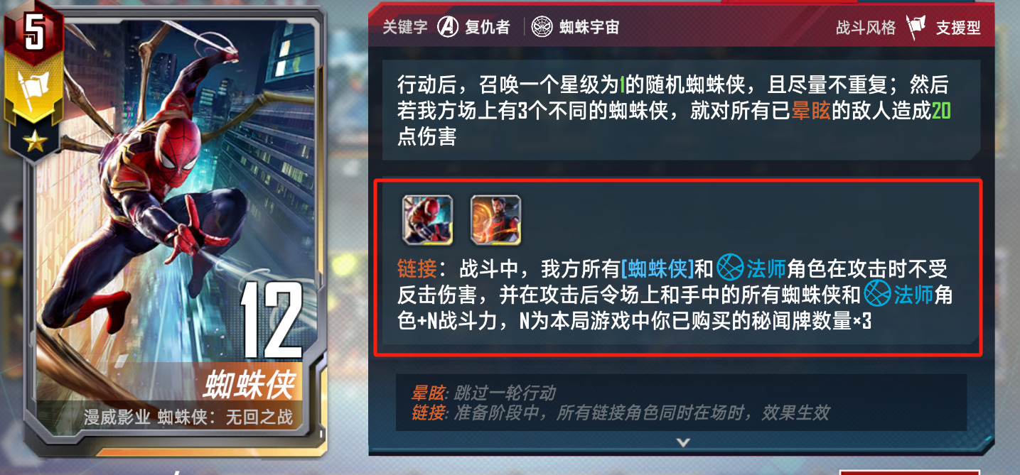 【荷兰弟链接改动】增加后半段“并在攻击后令场上和手中所有蜘蛛侠和法师单位+N战斗力”,这就让本链接能看上去战力不高,但越打越大。配合免伤效果,边白嫖边成长。