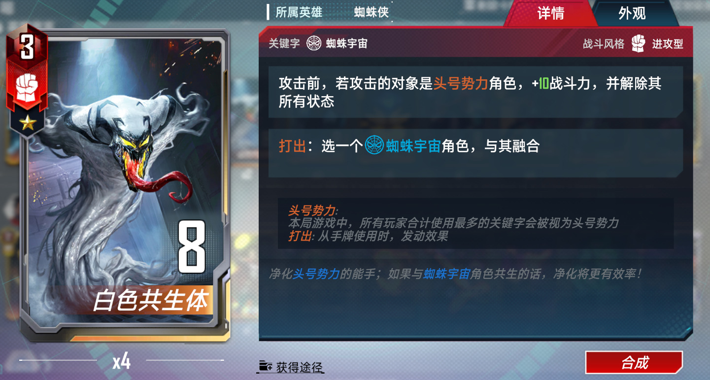 新卡白色共生体:针对声波和金并的好帮手。让荷兰弟和2099各融合一只,即可在进攻时一键清除对方的大身材。