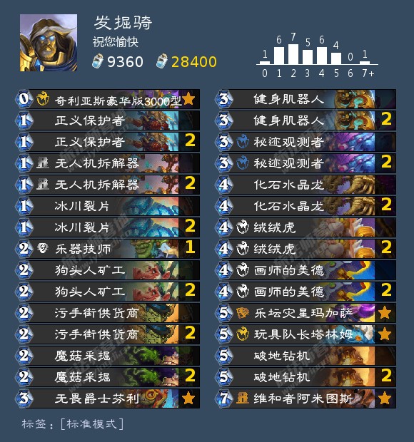 这套卡组质量很高,发掘出+3+3的艾泽里特龙,基本上就赢了,需要发掘四次以上。奇利亚斯是完美+计数