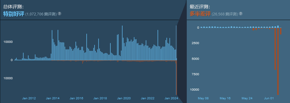 目前看来这项活动确实引起了大量关注,在 Steam 上游戏近期的用户评价出现了滑铁卢,从“非常好评”骤降至“多半差评”。从图中可以看到,差评“轰炸”是从 6 月 3 日请愿活动发起时开始大量出现的,在过去一天里游戏获得了 1.4 万条差评。