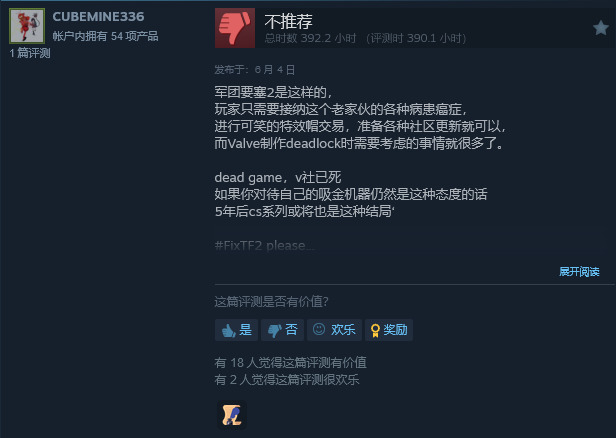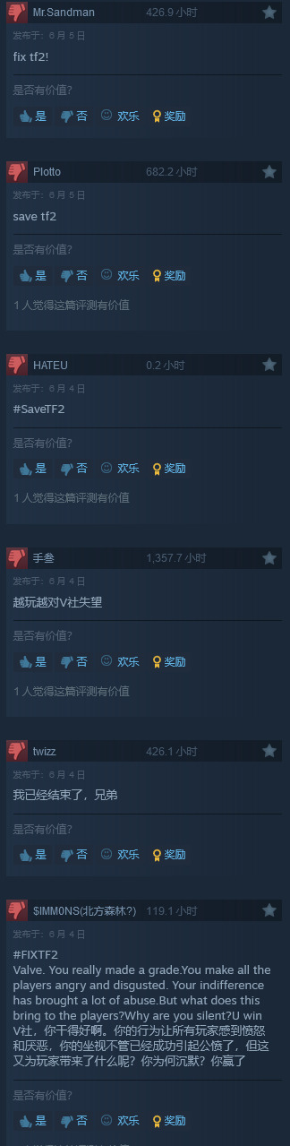 在《军团要塞2》的历史上,玩家从未发布过如此多的差评,即使是玩家最早发起“SaveTF2”倡议的 2022 年时,游戏也没有受到如此多的差评。这主要还是由于 V 社对于玩家倡议的不作为,虽然这可以说是 V 社一贯的作风了。