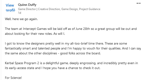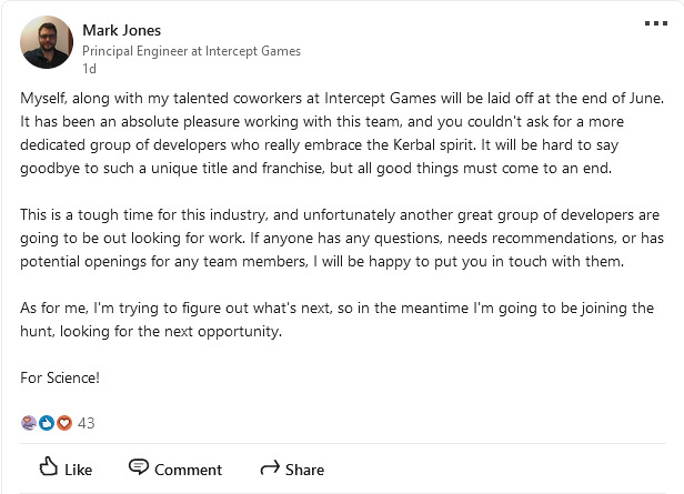 软件工程师 John Del Valle 在自己的帖子中写道:“我和 Intercept Games 的同事都受到了 6 月底最新裁员的影响。能够参与如此复杂且令人惊叹的系列工作是我的荣幸,我非常感谢有机会在 6 年期间作为《坎巴拉太空计划1》和《坎巴拉太空计划2》工程团队的一员。”