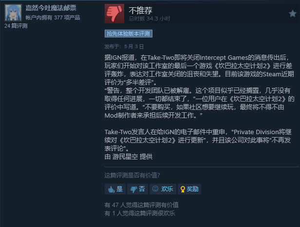 这意味着,几乎工作室所有的重要岗位都被裁员。Take-Two 此前的声明表示发行商 Private Division 将“继续对《坎巴拉太空计划2》进行更新”,没有提到 Intercept Games 进一步加深了工作室可能员工全部被裁的印象。