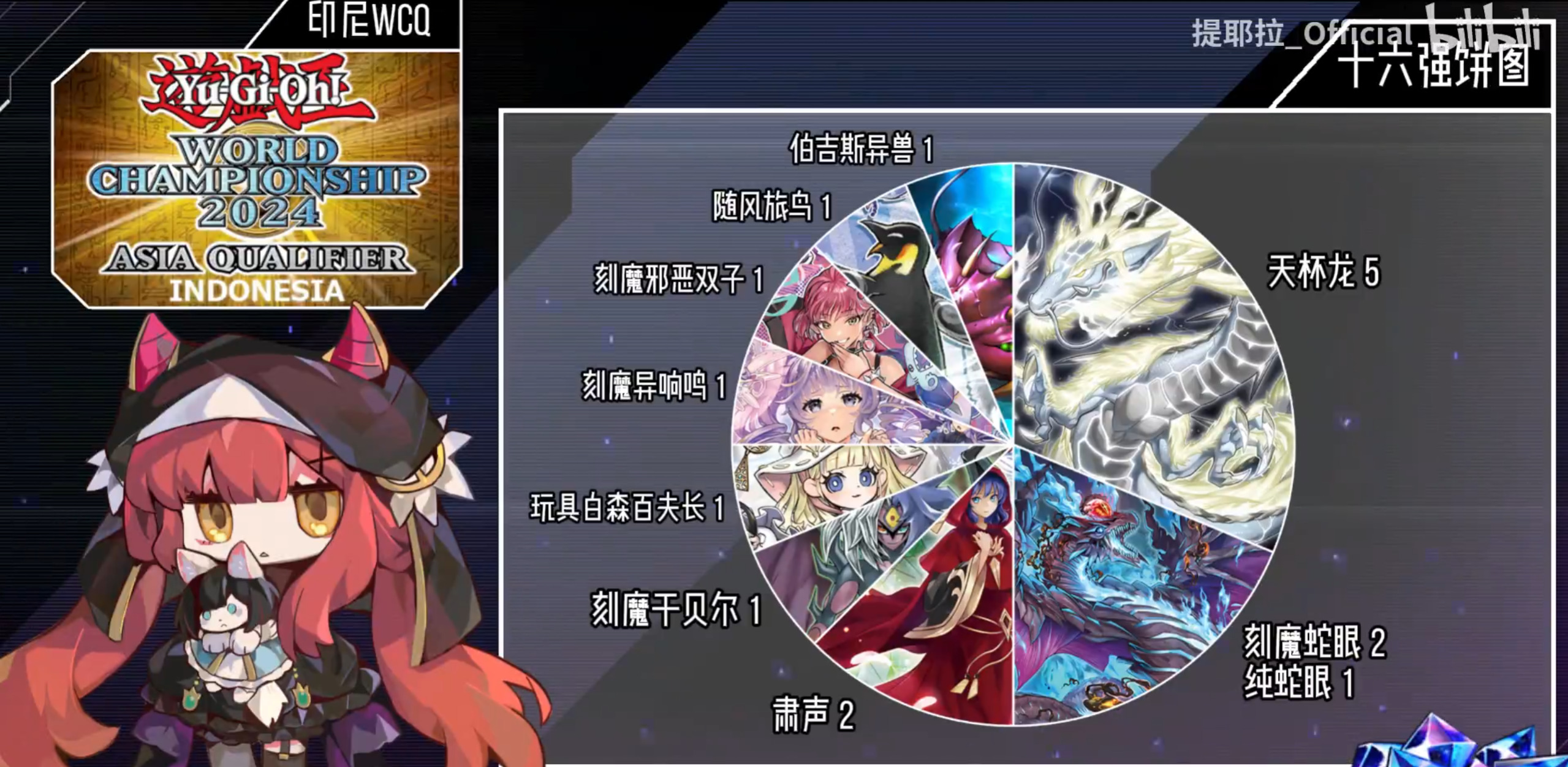 首先是5月18日于印度尼西亚举办的WCQ大赛,有226名选手参加,前十六名选手的卡组构成如下,可以看到有很多不得了的出轮卡组,比起国内的WCQ大赛有一种百花齐放的美感。