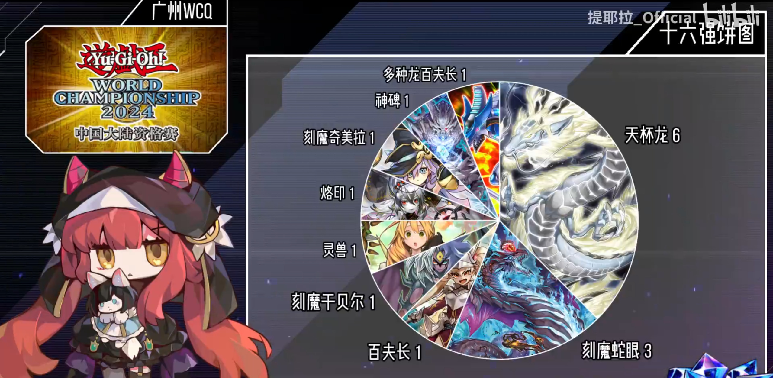 接下来是5月25日于广州举办的WCQ大赛,有480名选手参加,进入淘汰赛的十六强选手们卡组分布如下,诸如烙印灵兽神碑这类经久不衰的活跃于二线的竞技卡组们也不甘示弱的登上这份实力称王的大赛饼图。最终的前四位资格获得卡组为两位天杯龙,以及一位百夫长加上一位多种龙百夫长。