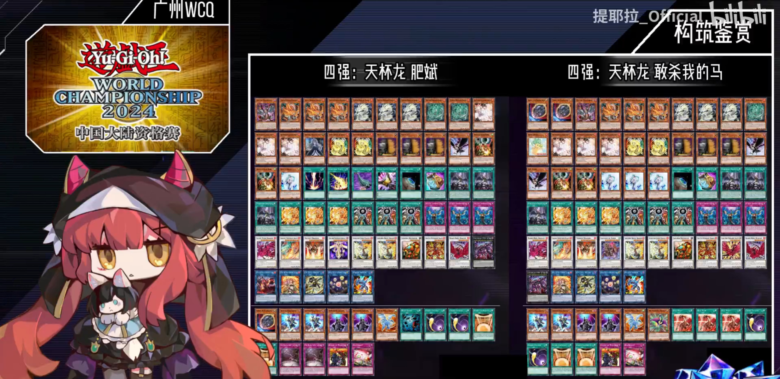 两位四强天杯龙的构筑一起摆出来对比一下,总体框架上有一些选手的个人风格,对于手坑的选择以及发龙和龙宝龙的投入配比上有各自的理解,肥斌选手在主卡内多投入了四张解牌,敢杀我的马选手则是将解牌换成了更多的手坑,备牌的大热波选择上则更是考究选手对于这张单卡的理解,印度尼西亚的三位出轮天杯龙皆未携带大热波,杭州站的三位,上海站的已知三位出轮天杯则都有携带,广州站的三位天杯中也有两位携带,整个wcq中国赛区环境目前的十一位出轮天杯中只有肥斌选手与北京站的prin选手没有携带大热波。顺带一提,敢杀我的马选手side中的神秘妙妙工具是禁止对手攻宣的日球层龙。