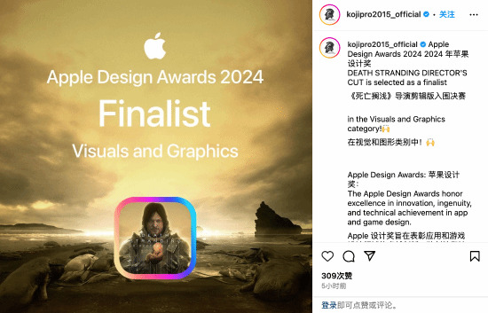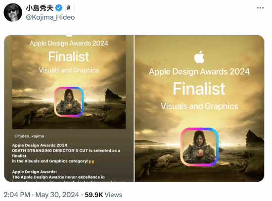 小岛秀夫工作室作品《死亡搁浅:导演剪辑版》获2024苹果设计奖提名,入围视觉效果和图形类别决赛。该作于今年登陆了苹果iPhone、iPad以及Mac平台。