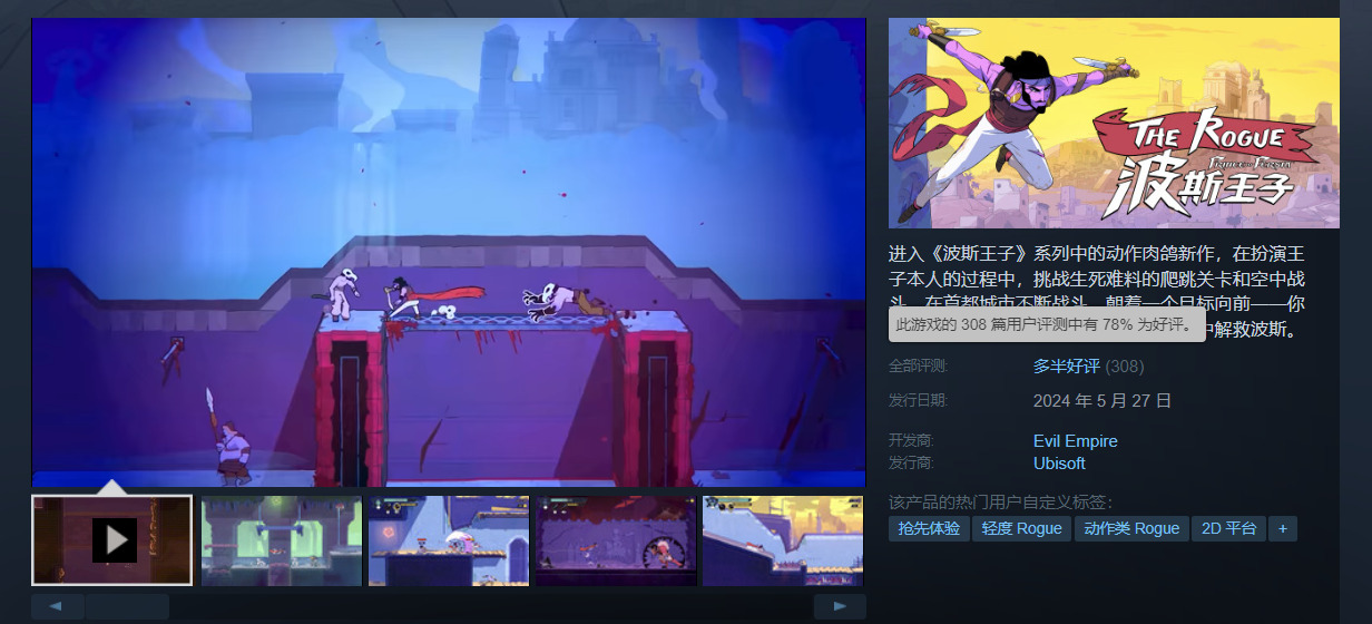 《波斯王子:Rogue》是育碧旗下经典动作IP《波斯王子》的最新作品。该游戏由育碧发行,《死亡细胞》的运营开发商Evil Empire进行开发,游戏现已登陆Steam,并,于5月31日开启抢先体验(Early Access)。游戏中,玩家将扮演拥有神秘吊坠的王子,在一次又一次的死亡后复活。在不断的尝试中,玩家将探索到不同的生态,掌握新武器,装备新饰品,在绿洲升级自己的装备,并召集盟友来拯救城市免遭毁灭。
