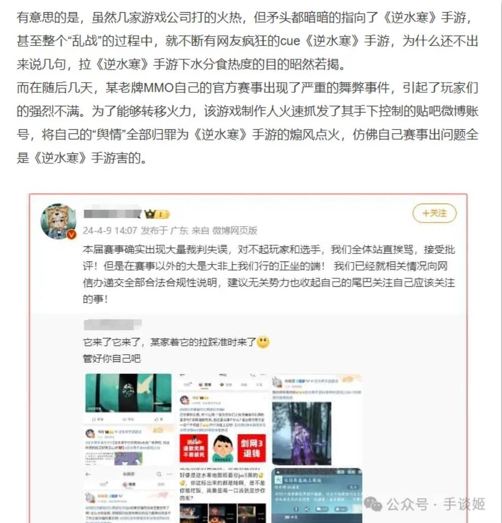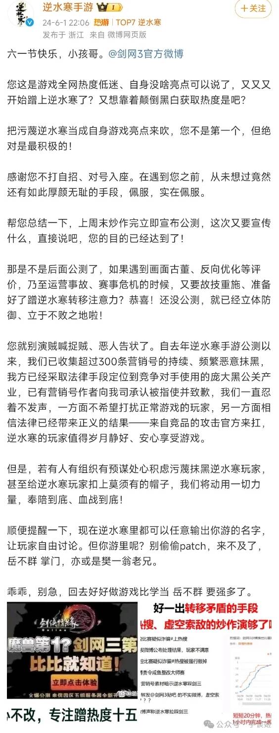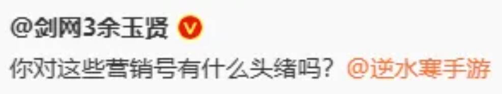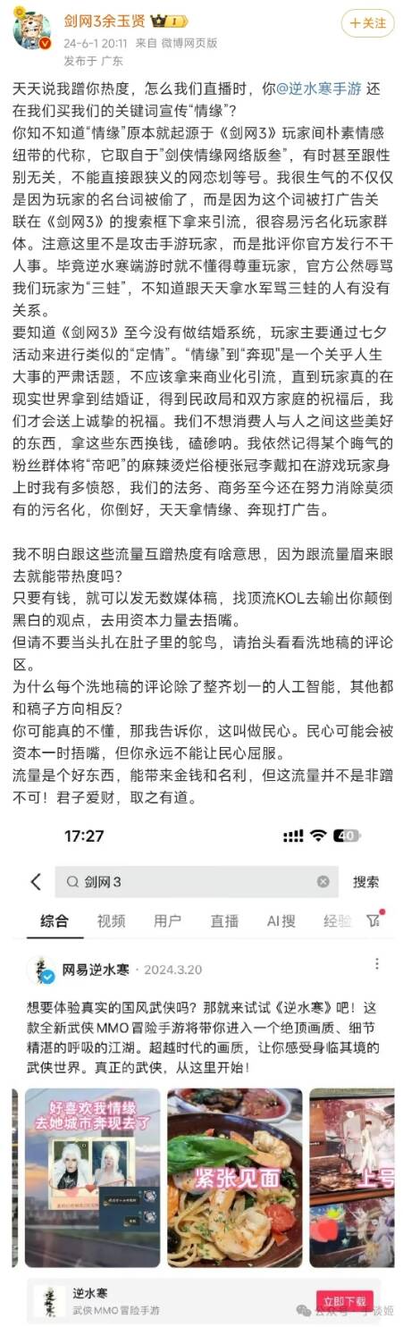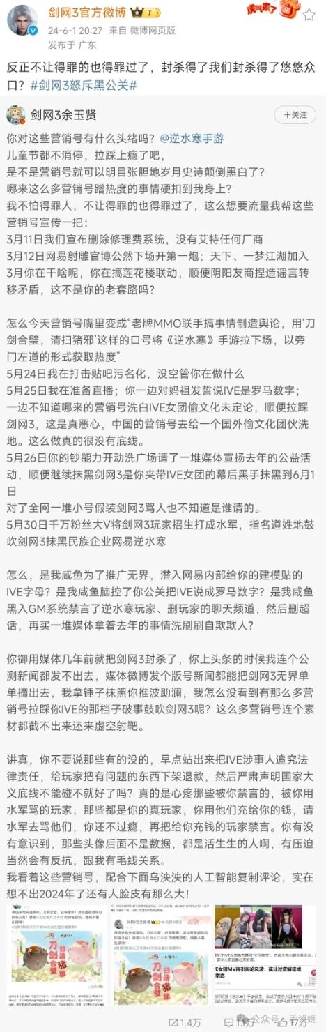 虽然上述文章或者视频没有点明“某老牌MMO”或“友商”是谁,但明显指的就是《剑网3》,估计再加上之前的怨气,《剑网3》的执行制作人余玉贤在微博上开起了第一炮,认为很多号都是《逆水寒手游》花钱买来抹黑《剑网3》的,怒斥《逆水寒手游》的拉踩行为。《剑网3》官博随即转发。