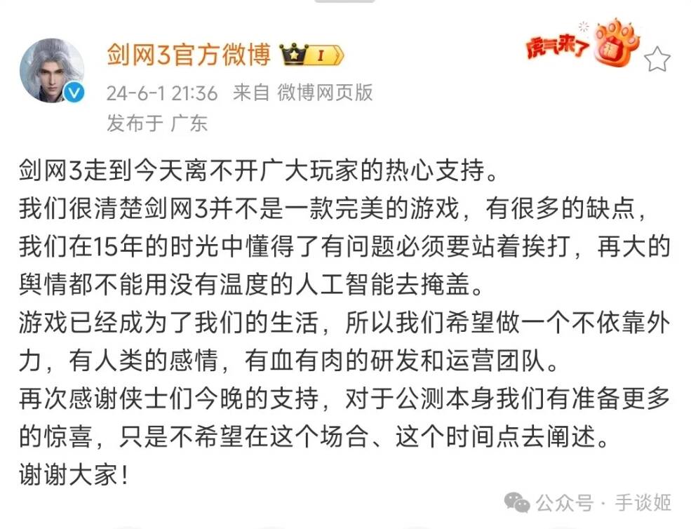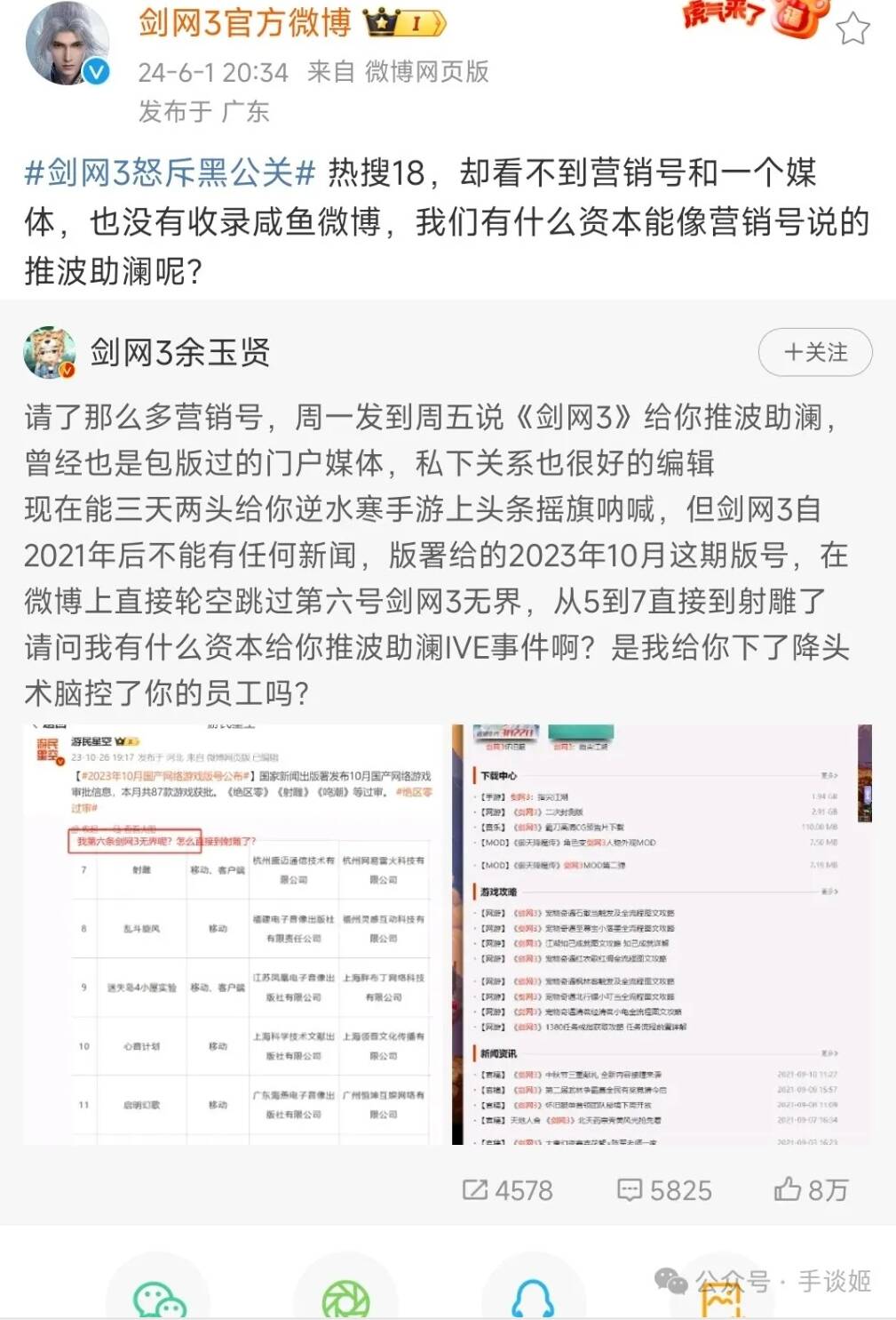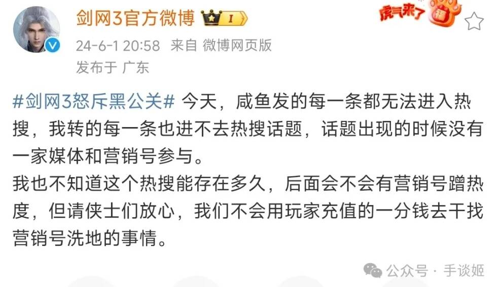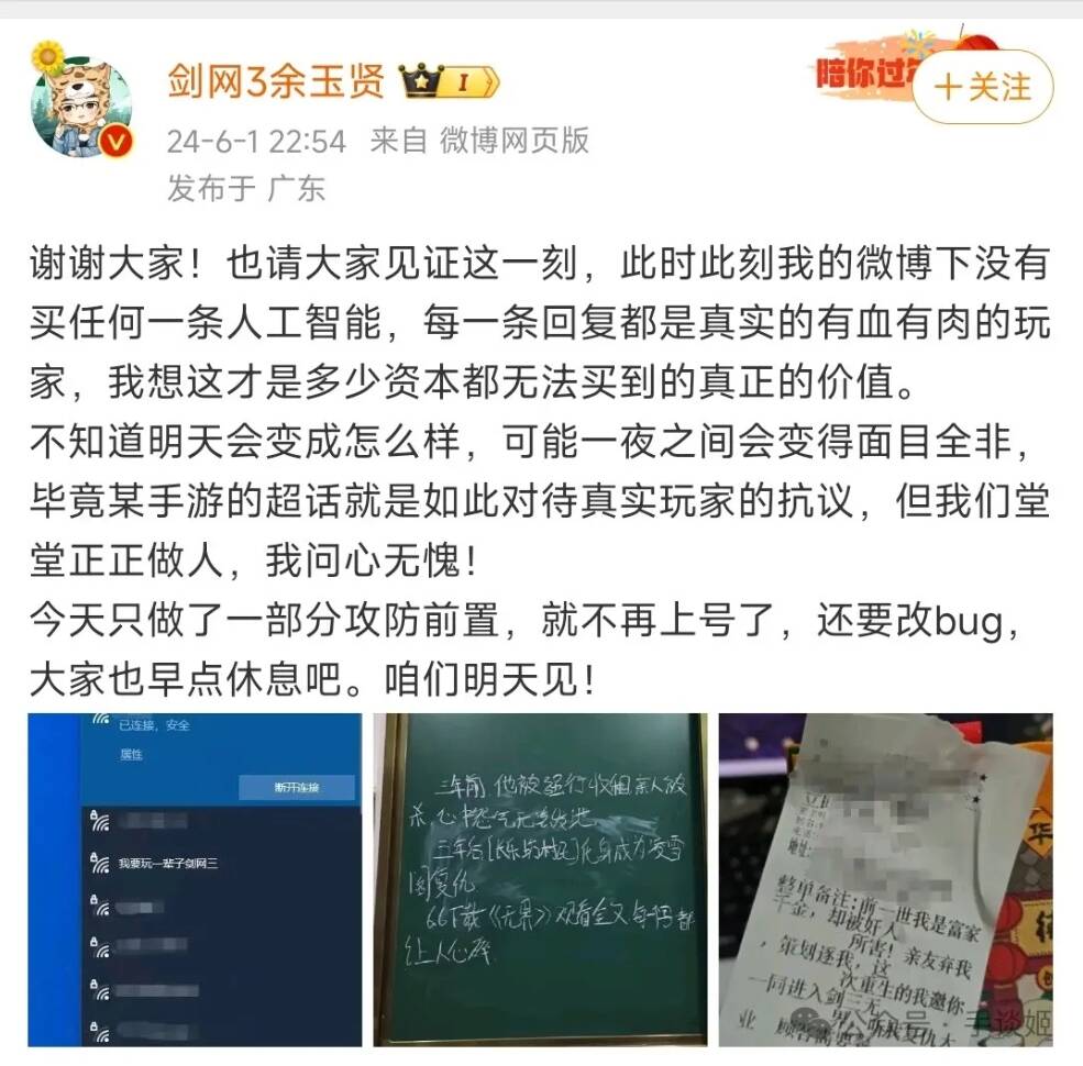虽然上述文章或者视频没有点明“某老牌MMO”或“友商”是谁,但明显指的就是《剑网3》,估计再加上之前的怨气,《剑网3》的执行制作人余玉贤在微博上开起了第一炮,认为很多号都是《逆水寒手游》花钱买来抹黑《剑网3》的,怒斥《逆水寒手游》的拉踩行为。《剑网3》官博随即转发。