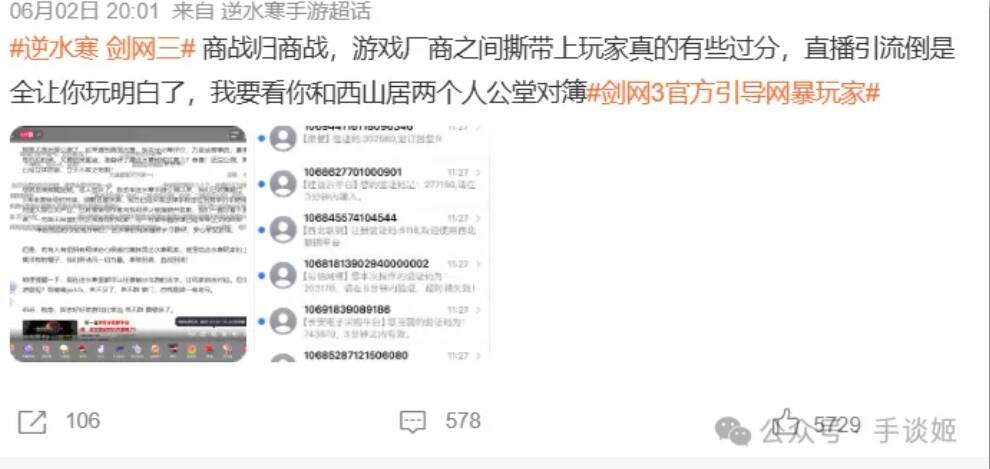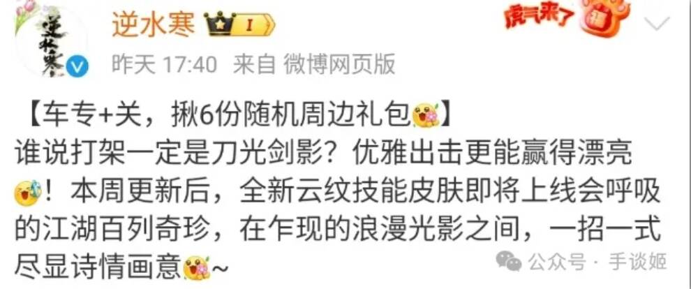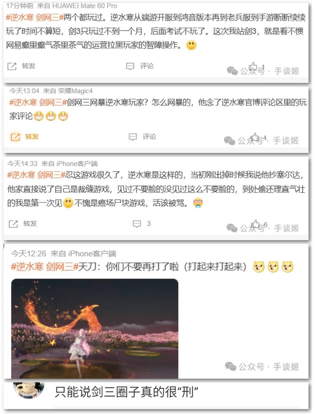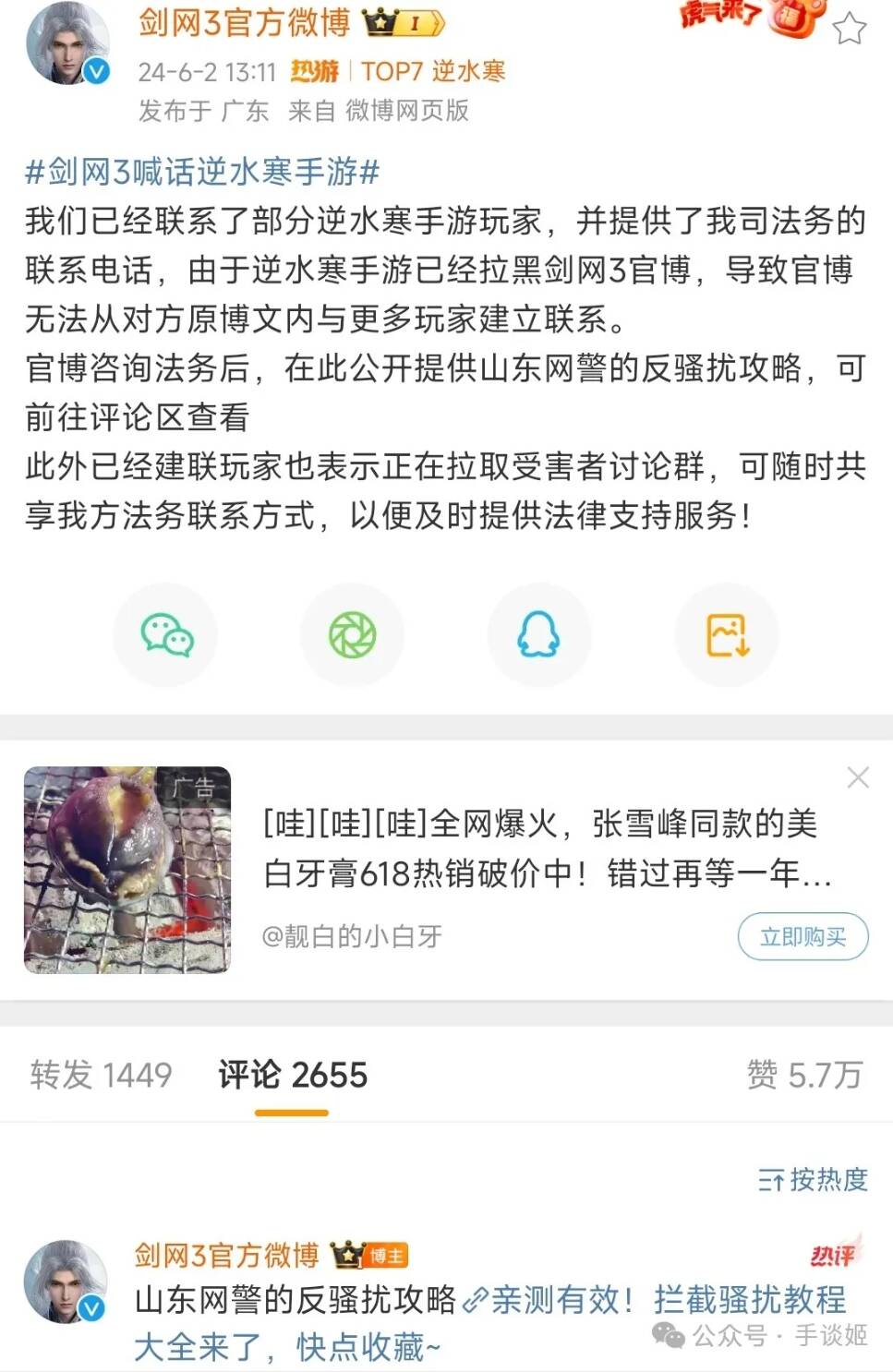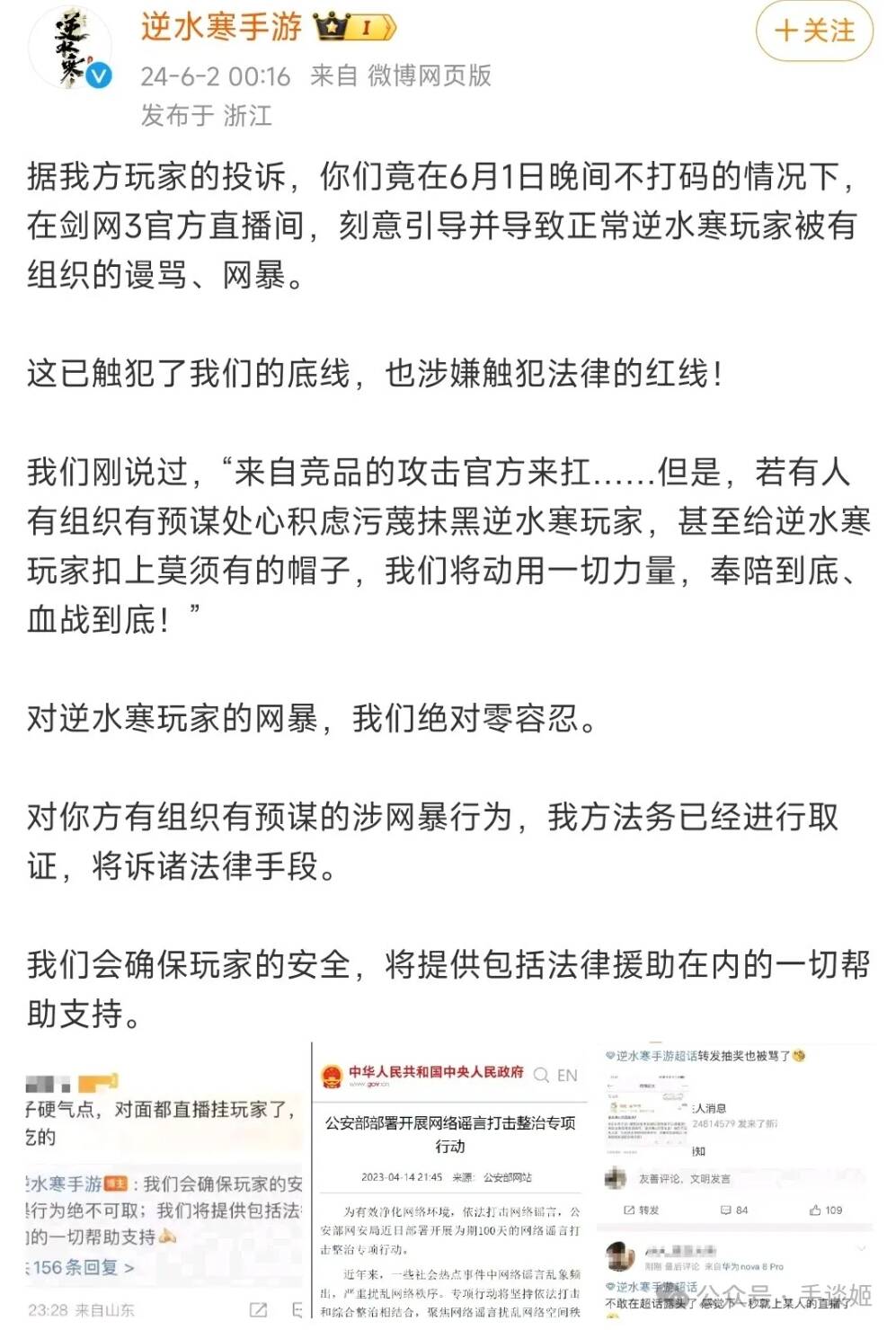 原来,《剑网3》官号似乎是杀上头了,在直播的时候跑到《逆水寒手游》官博读相关微博评论。