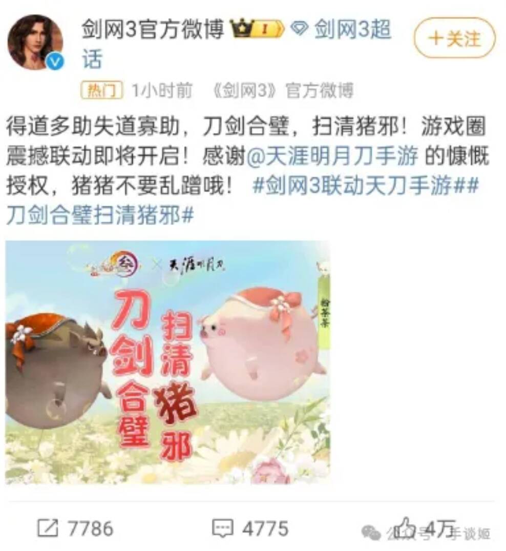 这波嘲讽过后,当天还没过24点,《剑网3》便官宣与腾讯旗下的游戏《天涯明月刀手游》进行联动,并且表示“猪猪不要乱蹭哦!”