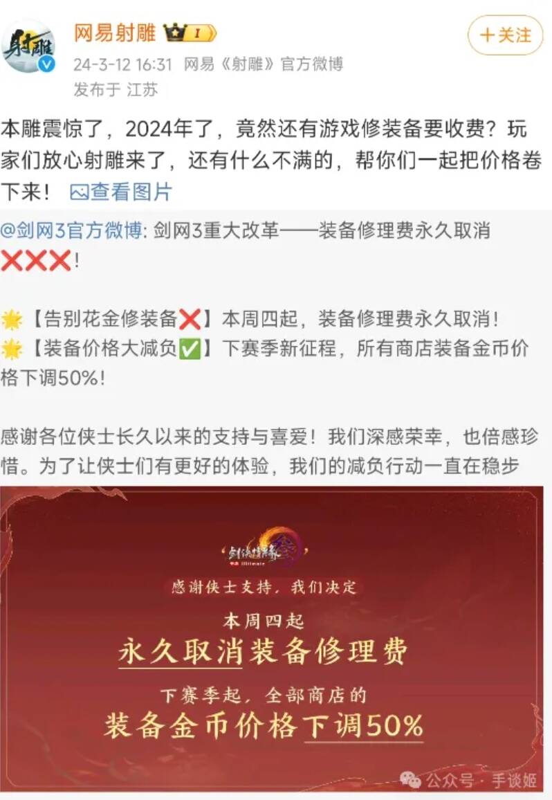 首先要说的是,这不是西山居和网易第一次爆发冲突。今年年初网易《射雕》转发了《剑网3》“永久取消装备修理费”的新政策并进行嘲讽。