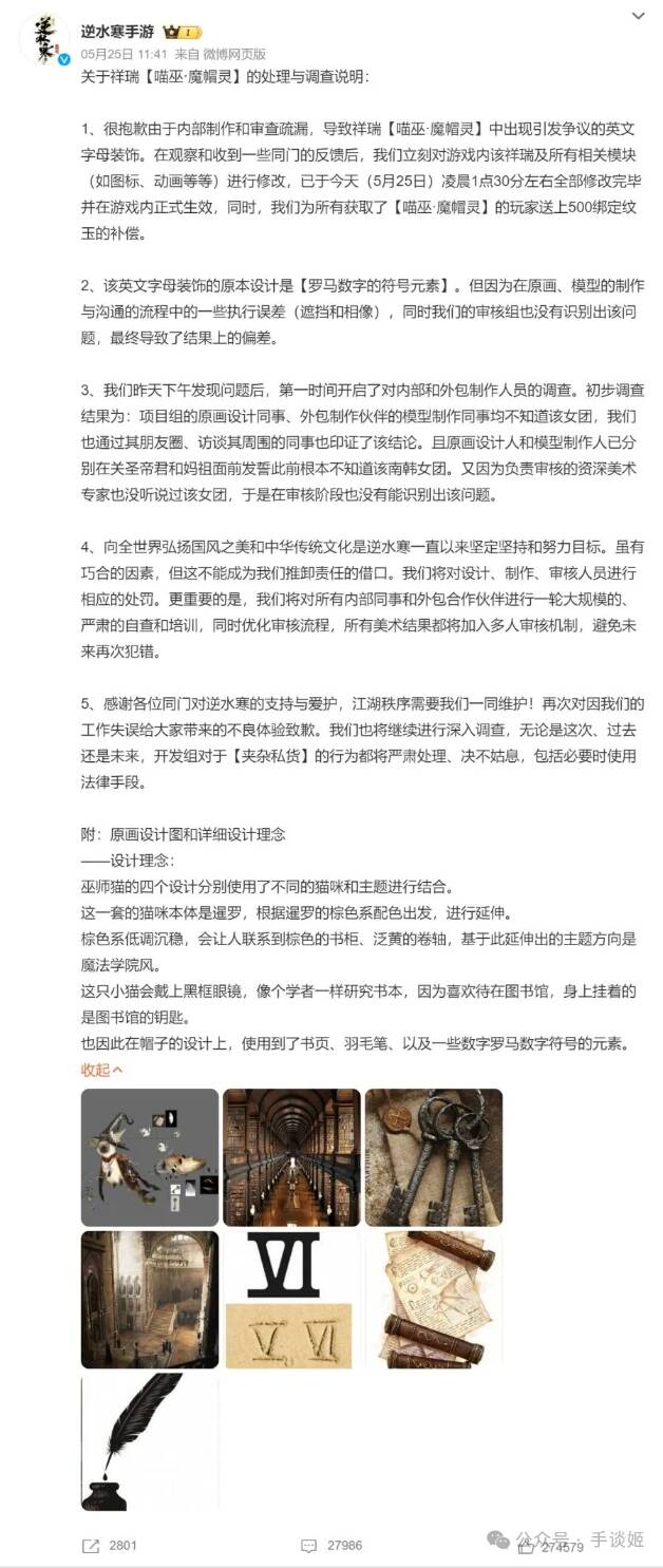 此事起因,还要追溯到《逆水寒手游》一只猫脑袋上带着帽子的事情上。此猫虽看起来呆萌可爱,但它帽子上疑似有英文字母“IVE”,如果放在前几年,这顶多是会被吐槽“这时候英语还没传进来这也太穿越了吧?”