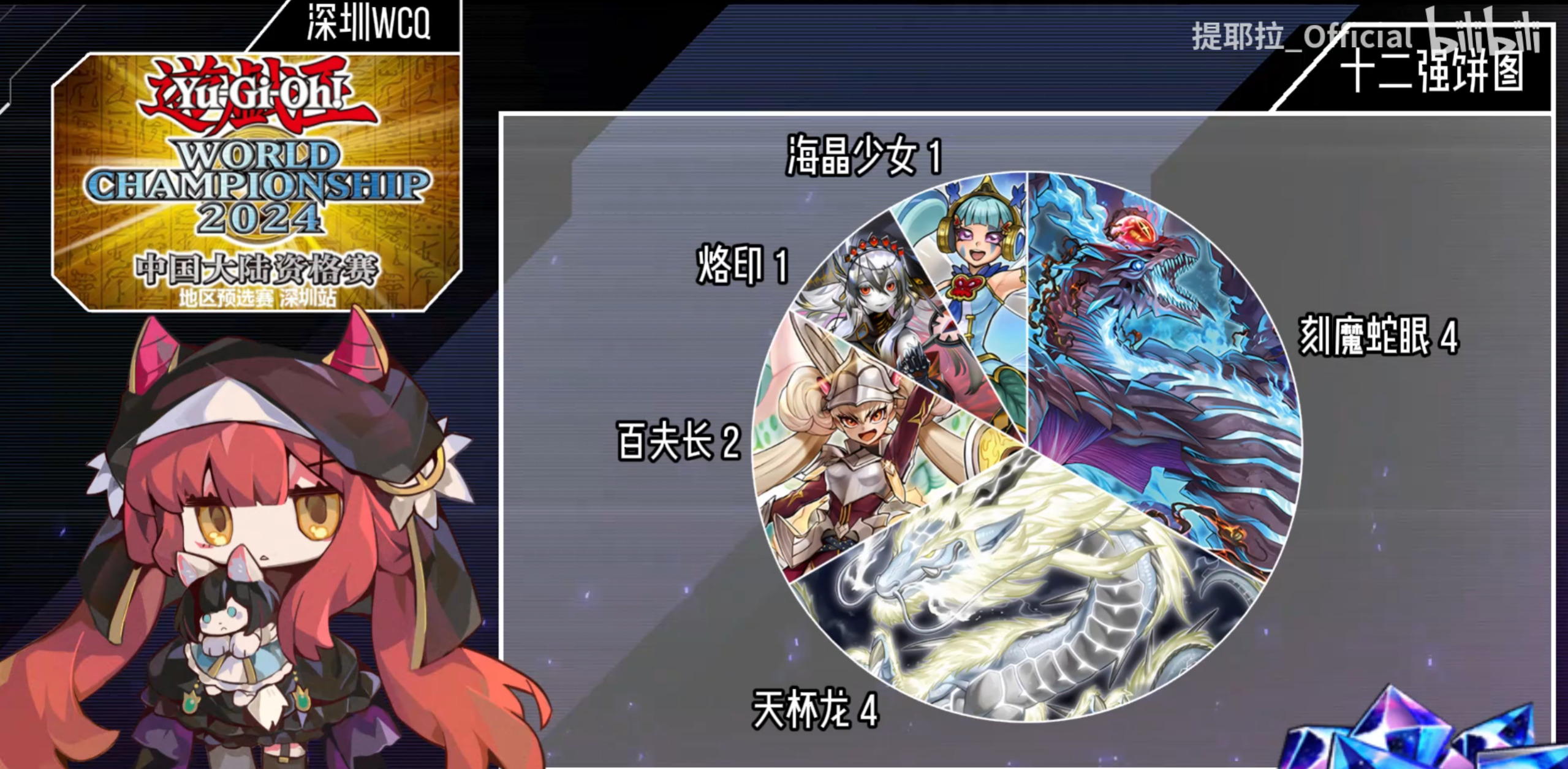 首先是六月一日于深圳举行的WCQ赛事,有360名选手参加,最终出轮的12强选手们使用的卡组分布如下,依旧是蛇眼天杯占据大头加上最近花样出轮的种子选手百夫长,以及一位经久不衰的饼图赖子烙印和一位最新最潮的百分百出轮率情报卡组海晶少女。