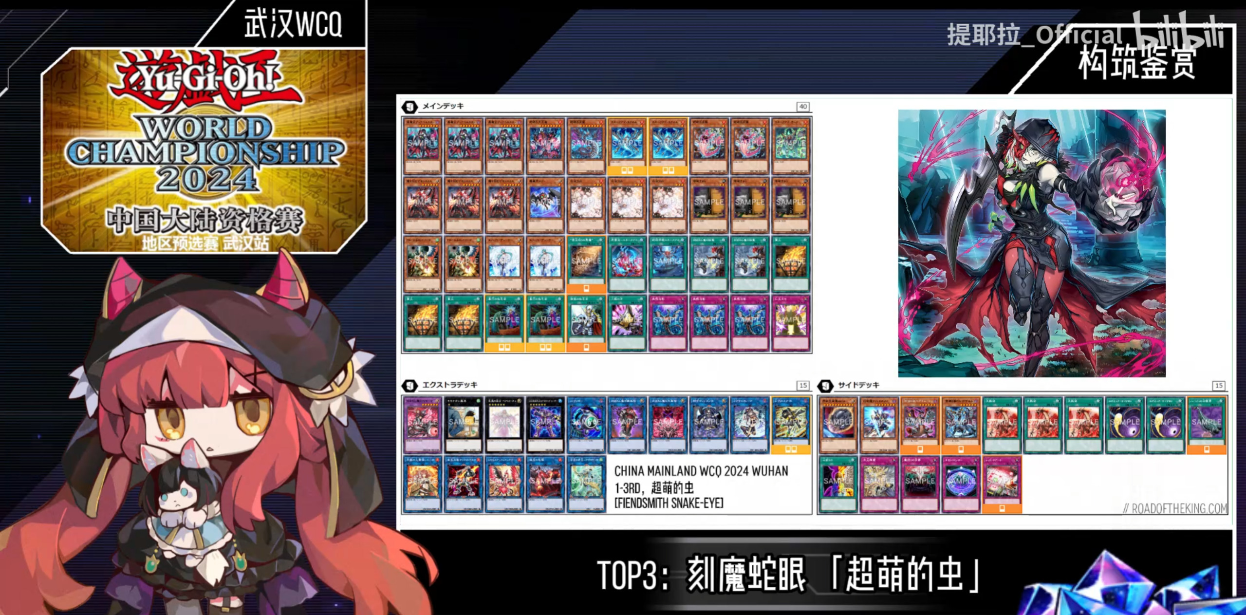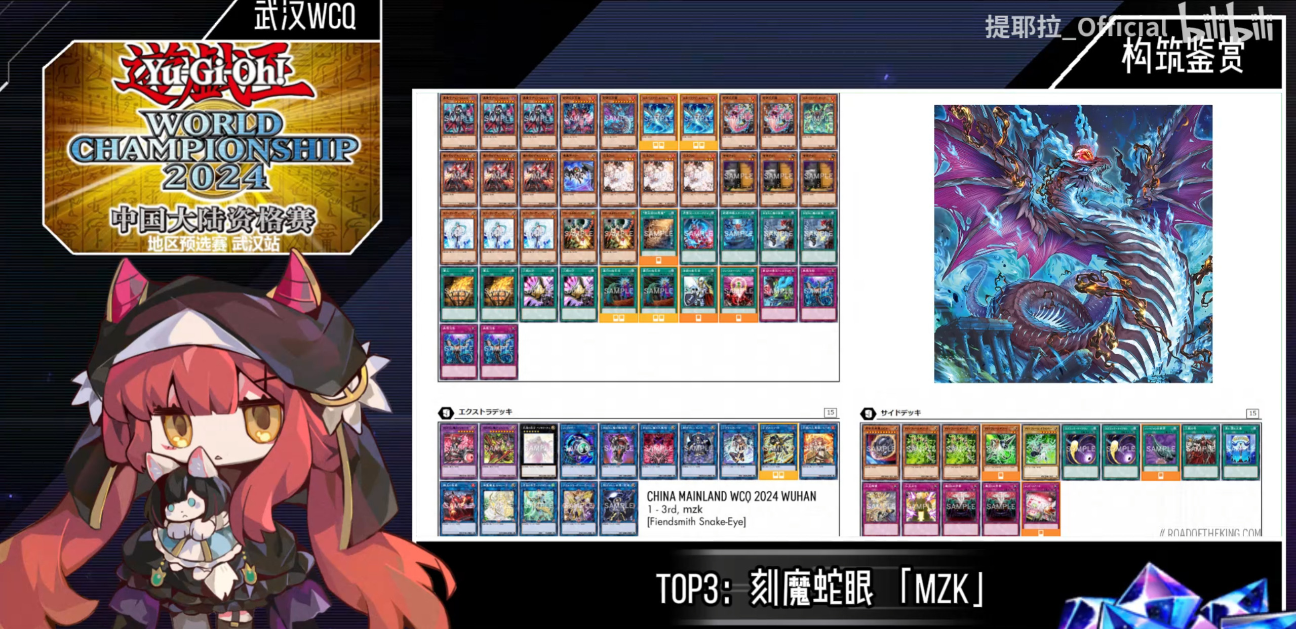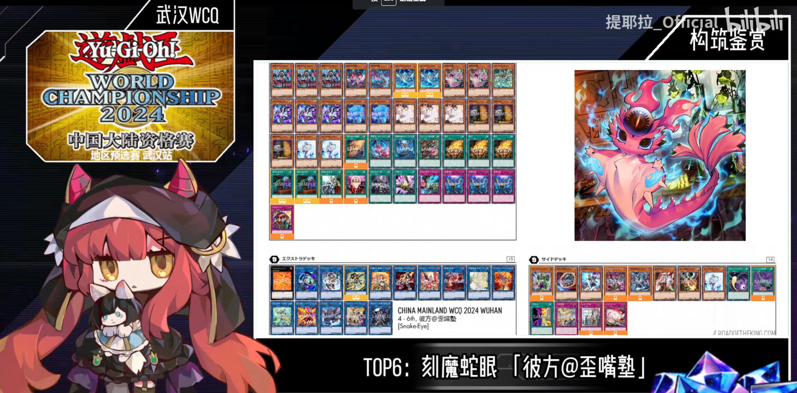 同为资格获得者的异议选手采用的刻魔蛇眼构筑也是特别的有个人风格,可以看到额外卡组并没有选择投入神弓或者大怒涛,除了side卡组中的皇帝斗技场以外没有任何的防陨手段。选手本人的观点为神弓和怒涛的重要性不如其他的额外组件,索性直接不防陨当成必吃陨石来进行展开,如此奔放狂野的打法在这个比较保守的竞技环境中还是比较新颖亮眼的,让我们接着看看下一位选手的构筑。