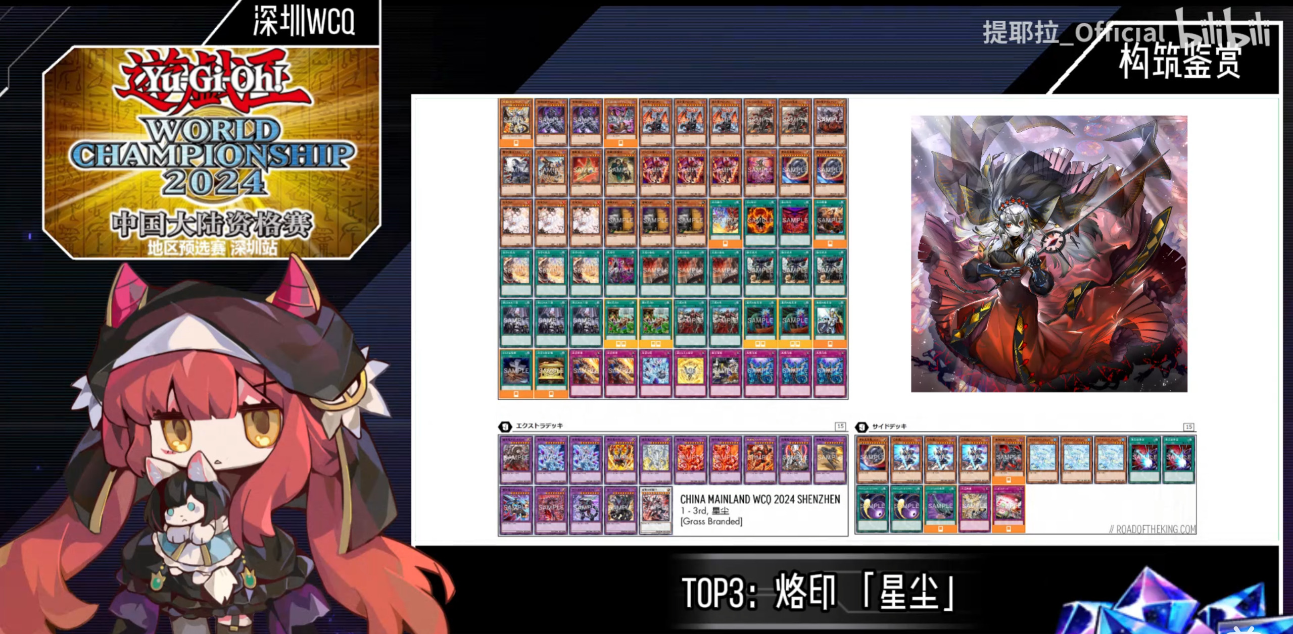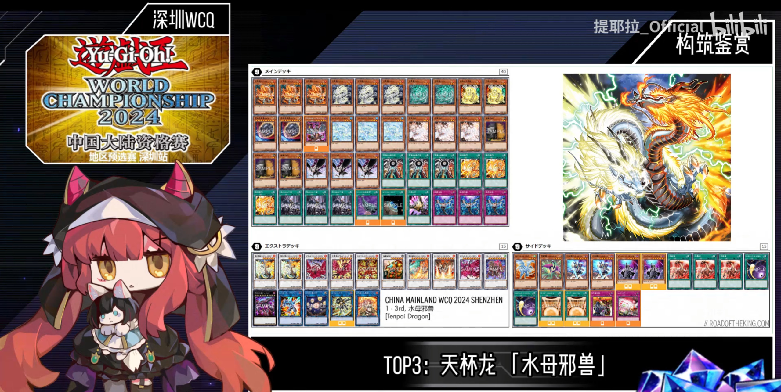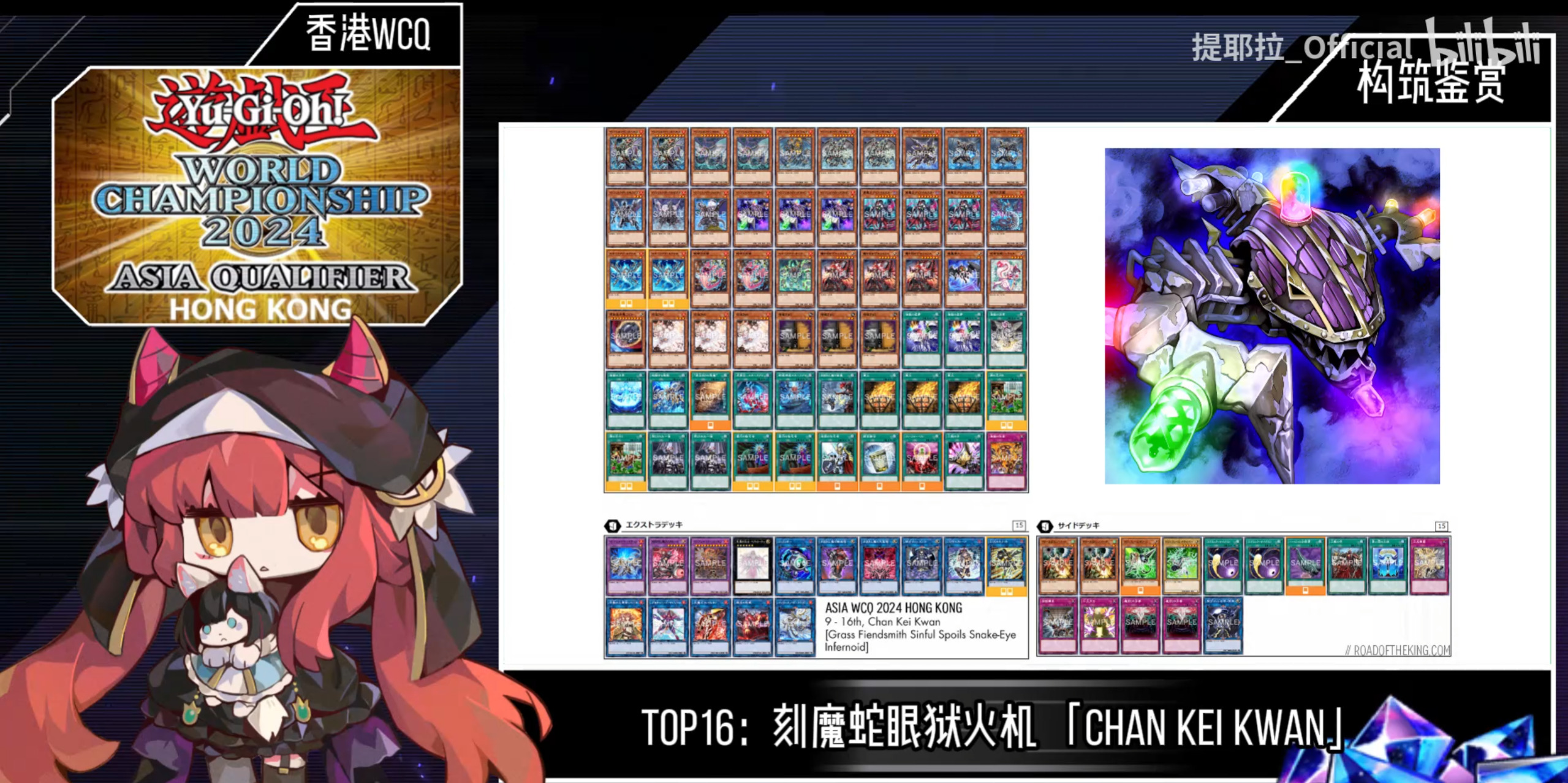 同为资格获得者的异议选手采用的刻魔蛇眼构筑也是特别的有个人风格,可以看到额外卡组并没有选择投入神弓或者大怒涛,除了side卡组中的皇帝斗技场以外没有任何的防陨手段。选手本人的观点为神弓和怒涛的重要性不如其他的额外组件,索性直接不防陨当成必吃陨石来进行展开,如此奔放狂野的打法在这个比较保守的竞技环境中还是比较新颖亮眼的,让我们接着看看下一位选手的构筑。