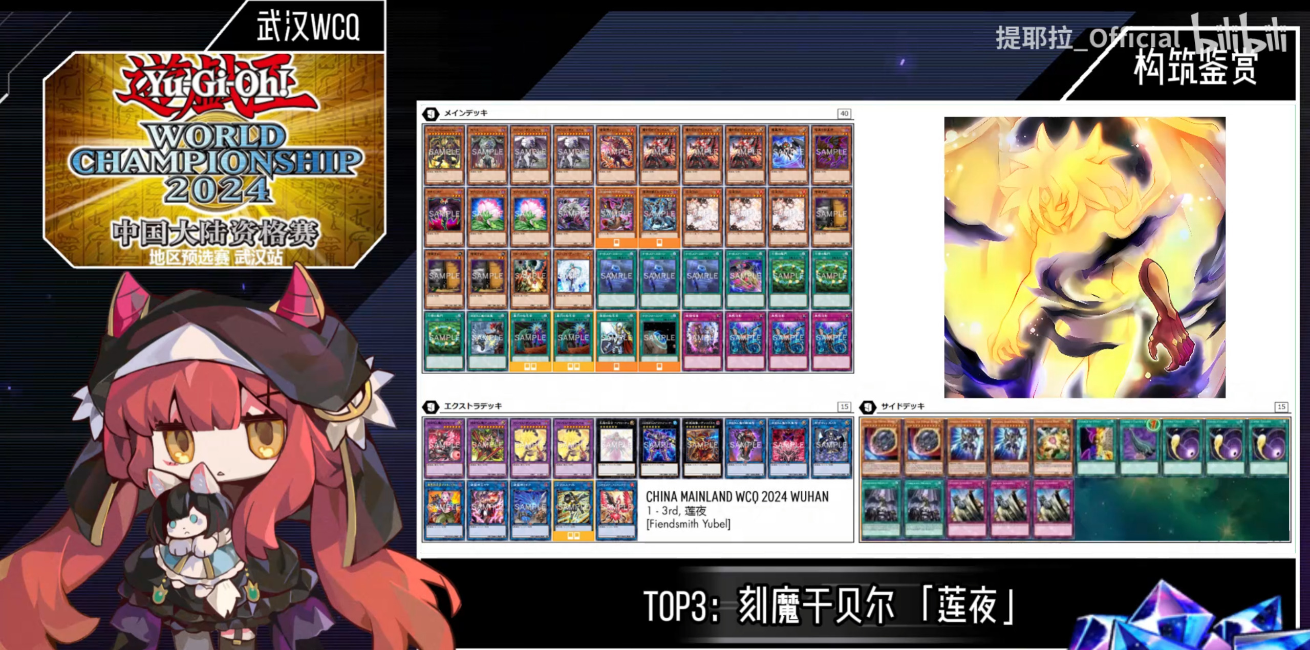 莲夜选手使用刻魔于贝尔在一大堆蛇眼之中杀出重围夺得前三甲的成绩,整体构筑采用了压缩40卡来期待展开部件的稳定上手以及增加换备牌后的side上手率。杭州给趣卡牌发表了莲夜选手的构筑思路分享,内容特别详细,可自行前往浏览学习。