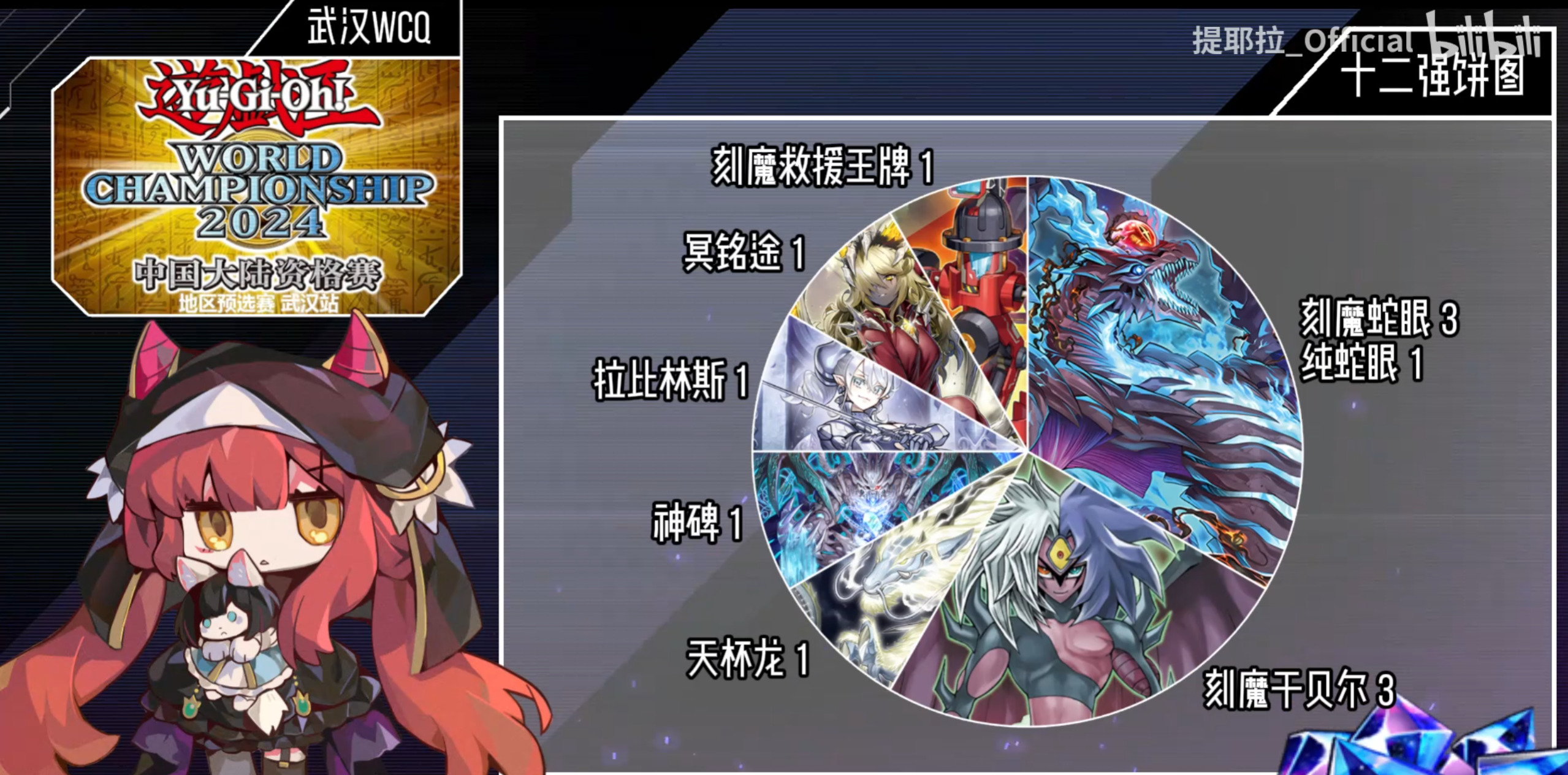 把目光移到同为六月一日举行的武汉wcq大赛现场,本场大赛同样有360名选手参加,最终得到了十二强名次的出轮选手们使用卡组饼图如下,国内wcq首次有莫忘卡组出轮,拉比林斯以及救援王牌也是继北京站后二度出轮,顺带一提本次的四位出轮蛇眼中有一位使用了纯蛇眼的构筑。