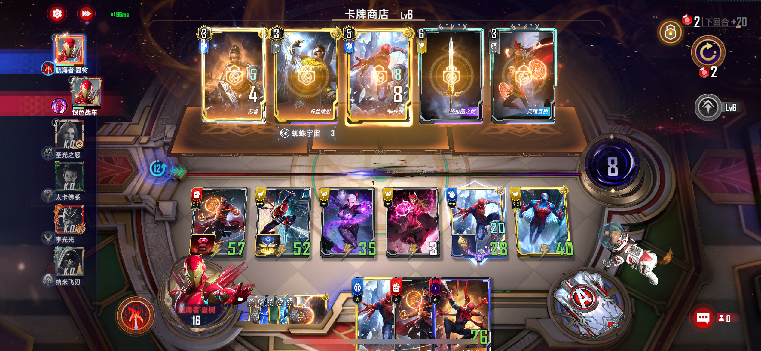 太空博士:可以提供刷新,打同行可以保留不被克利亚吃,他攻击对方的蓝蜘蛛侠可以有几率冲掉蜘蛛侠两侧的2099和克利亚