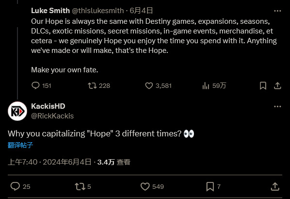 Luke Smith 在推特上讨论了刚刚推出的《命运》历史长达十年以上的“光与暗之章”故事的最终章《命运2:终焉之形》资料片。在最后一段中他说道:“我们对《命运》游戏、资料片、赛季、DLC、异域任务、秘密任务、游戏内活动、商品的希望(Hope)始终如一。我们真诚地希望(Hope)您享受在其中度过的时光。以及我们已经制作或即将制作的任何东西,这就是我们的希望(Hope)。”