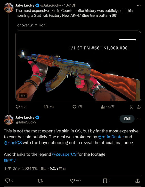在今年 1 月,这个蓝宝石 AK-47 皮肤被大多数玩家所发现,但据称它实际上已经在收藏家手中秘密存在数年。这款皮肤稍微更旧的版本售价高达 40 万美元。100 万美元的价格即便对于《反恐精英》来说也是非常高的。虽然据称它并不是最贵的,但在公开的交易中它的成交价是最高的。