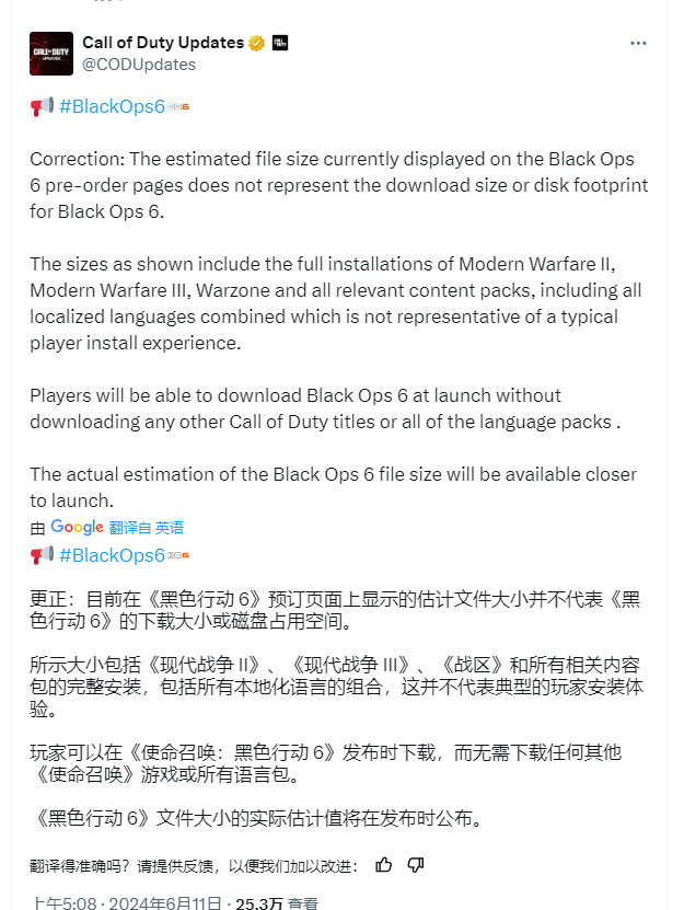 有关《黑色行动6》文件大小的实际估计值,将在临近发售时公布。