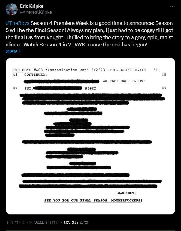 反超级英雄美剧《黑袍纠察队》即将于6月13日在美国播出,近日其主创埃里克·克莱普克(Eric Kripke)在推特上宣布了第五季的消息。
