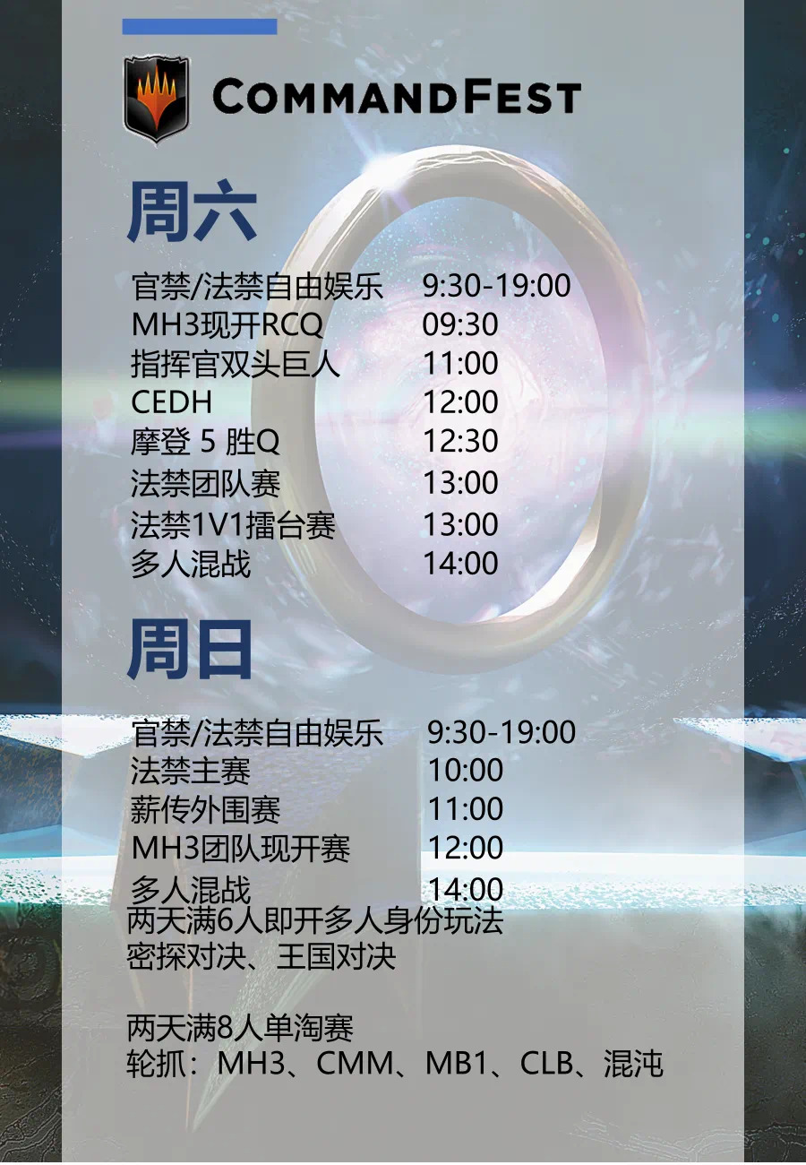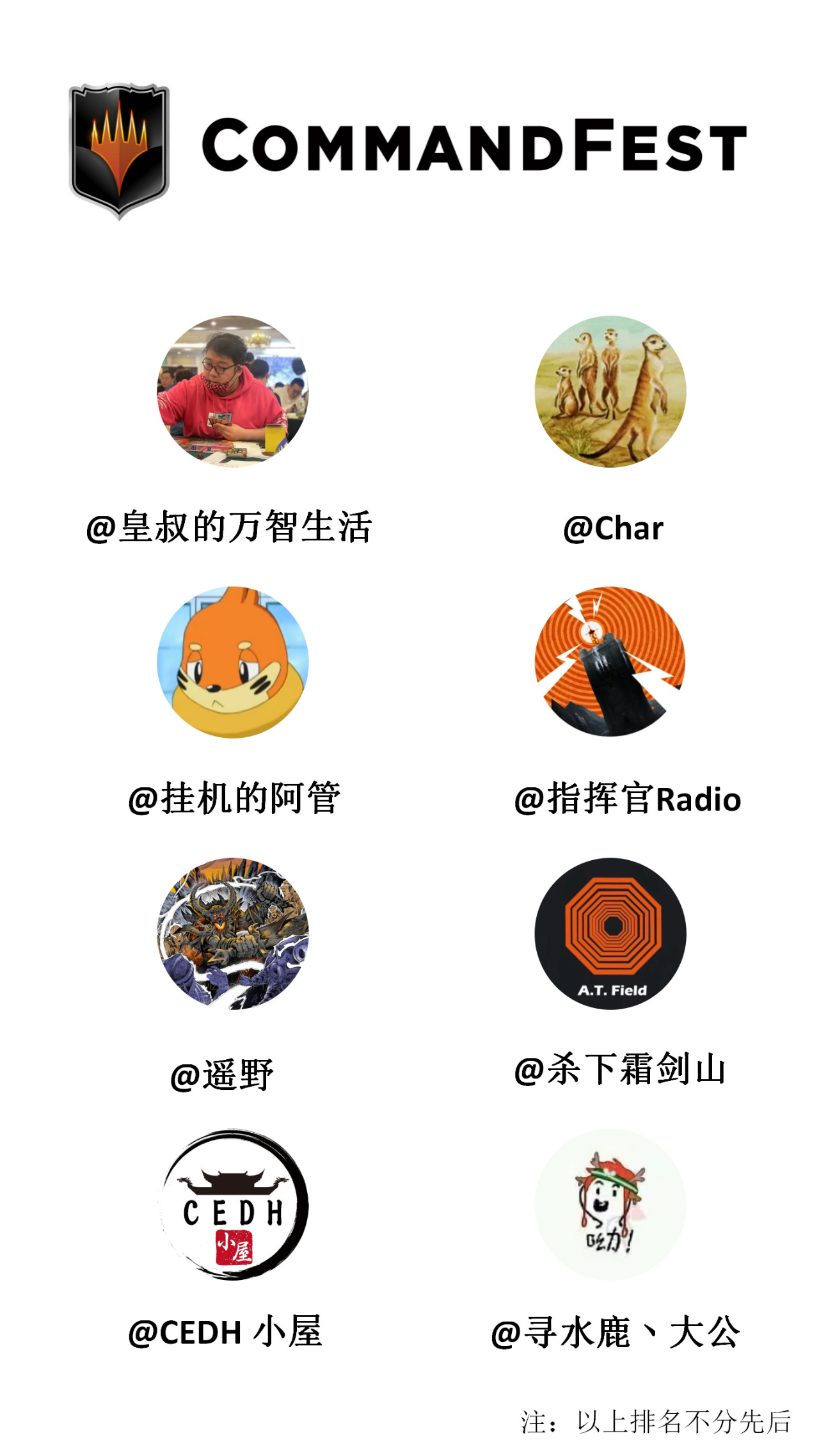 玩法,指挥官作为一个以娱乐为主的赛制,向来不是只有一种玩法,官禁、法禁、等等等等,在 CommandFest 的舞台,我们希望与玩家共创一次指挥官节,无论您想玩何种玩法,只要能够有支撑游戏开始的人数,请与我们联系,我们都愿意协助组织。这个周末,社群的你才是主角。截止目前我们已经和法禁、 CEDH 的社群沟通相关活动。如果你也有一群小伙伴想要玩其他的玩法,欢迎与我们联系。